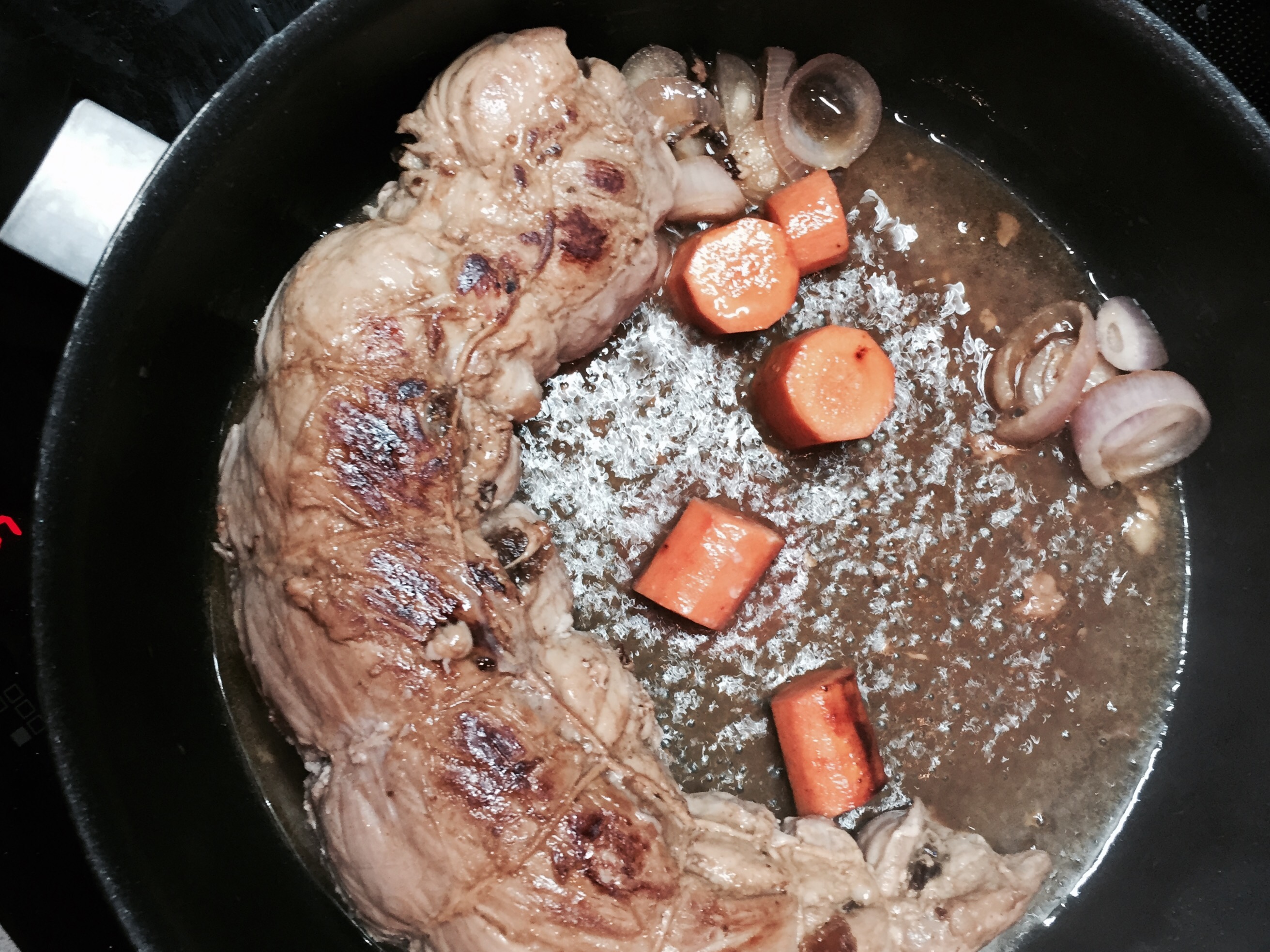 In einer Pfanne Olivenöl etwas Butter, ca. ein Esslöffel und 1 Zweiglein Thymian schmelzen lassen und das Schweinefilet von allen Seiten gut anbraten. Eine Karotte und eine Schalotte in groben Stücken dazugeben und einige Minuten mitdünsten.