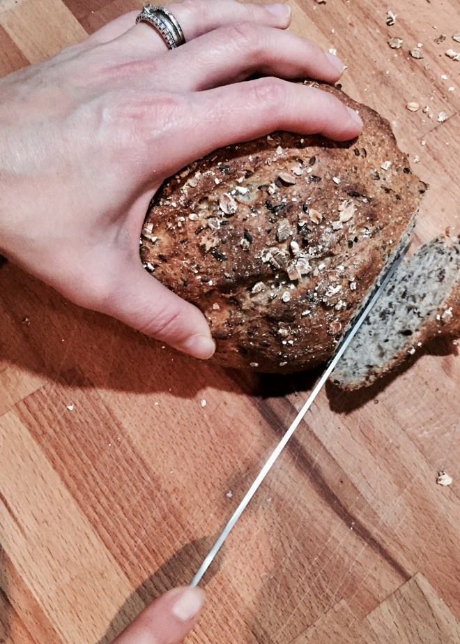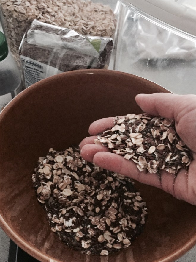 Die Kerne (also Haferflocken, Leinsamen, Hartweizengriess und Chiasamen) mit 134 ml Wasser und dem Salz für ca. 2 Stunden quellen lassen.