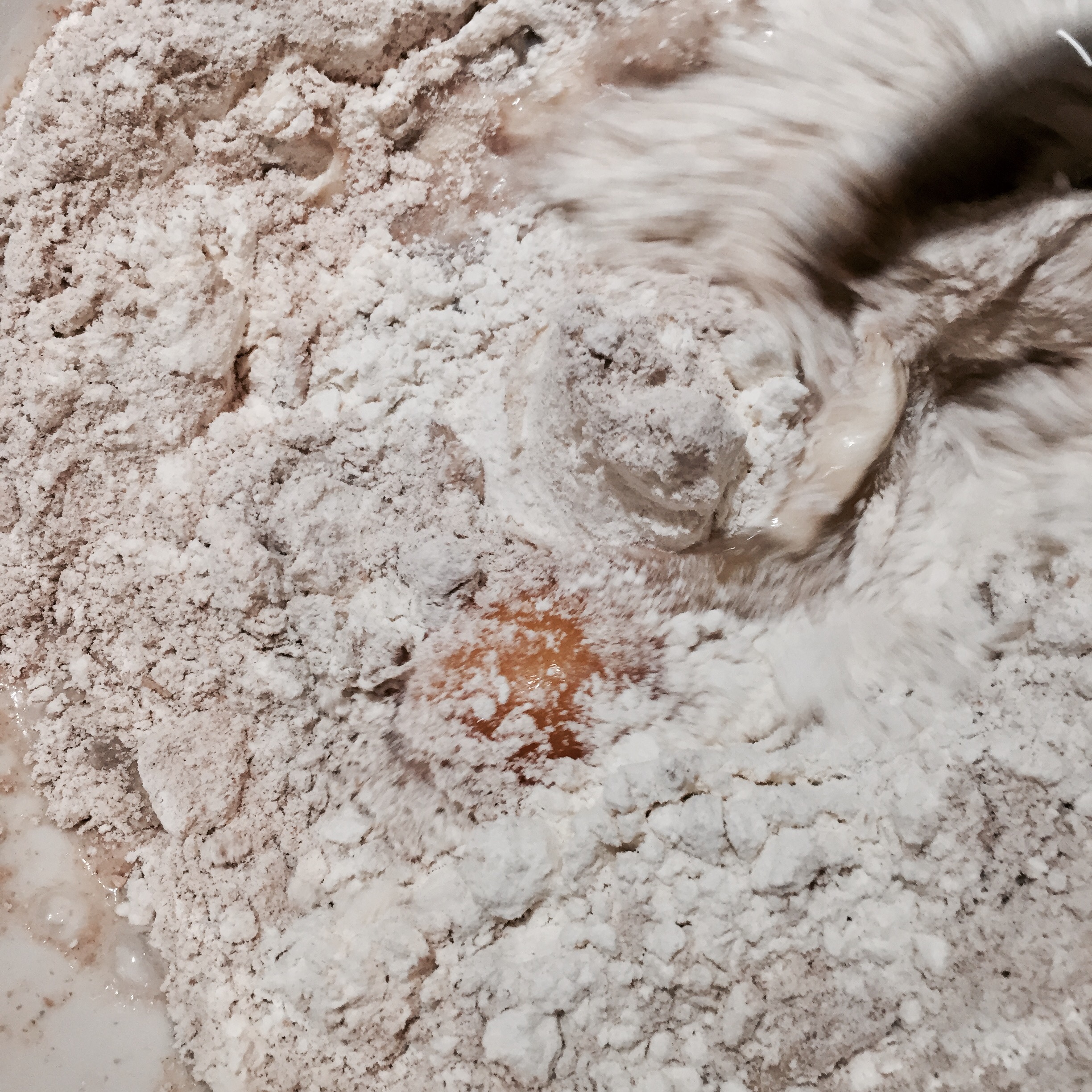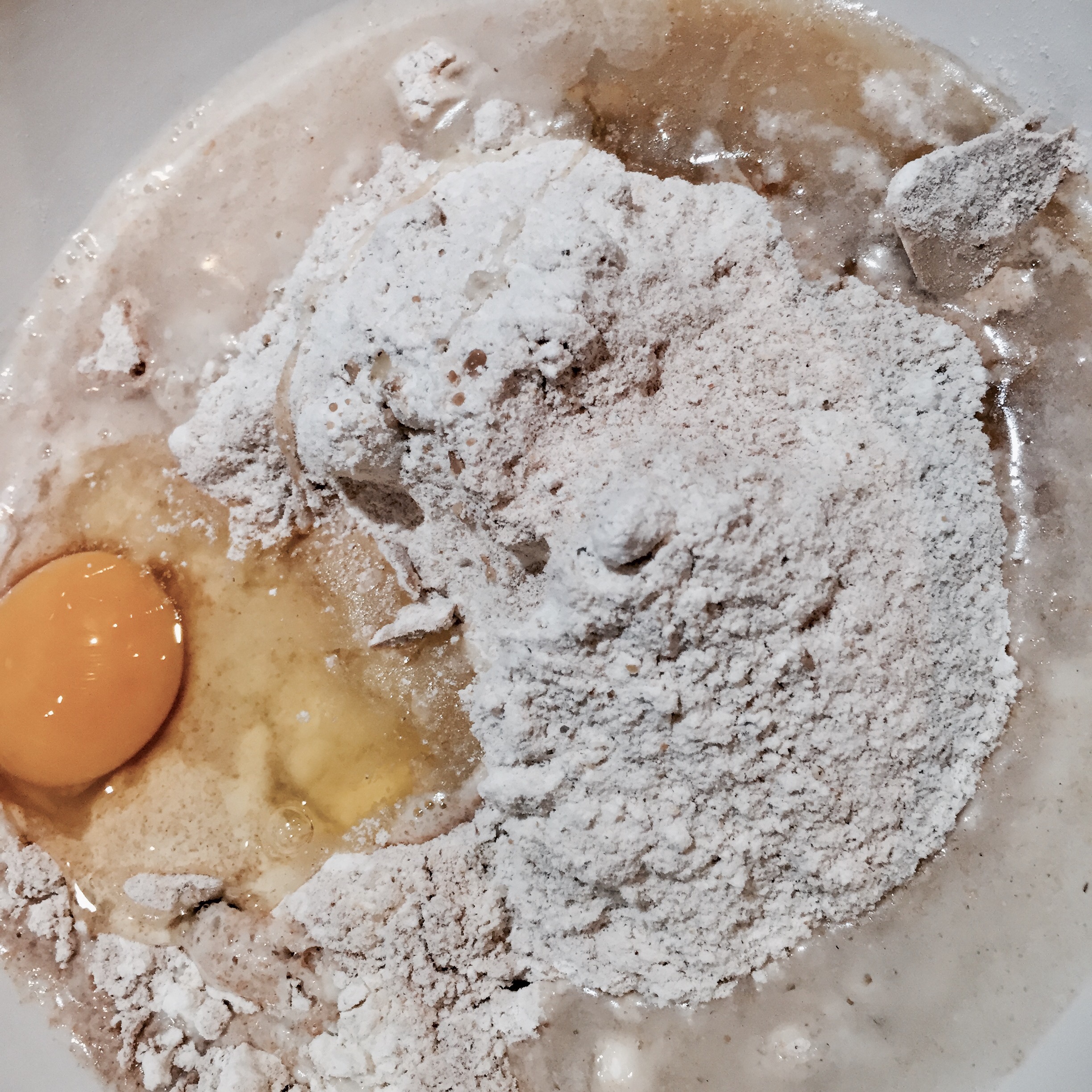 Den Teig in einer Schüssel im Kühlschrank 10-12 Stunden ruhen lassen, und weitere 5-6 Stunden an einem warmen Ort (bei mir im Ofen bei 30Grad). Dabei immer wieder kneten und falten (3 Mal insgesamt).