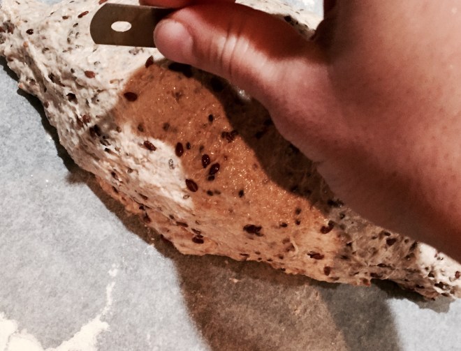 Nach dieser Zeit dem Brotlaib die gewünschte Form geben und mehrmals einschneiden.