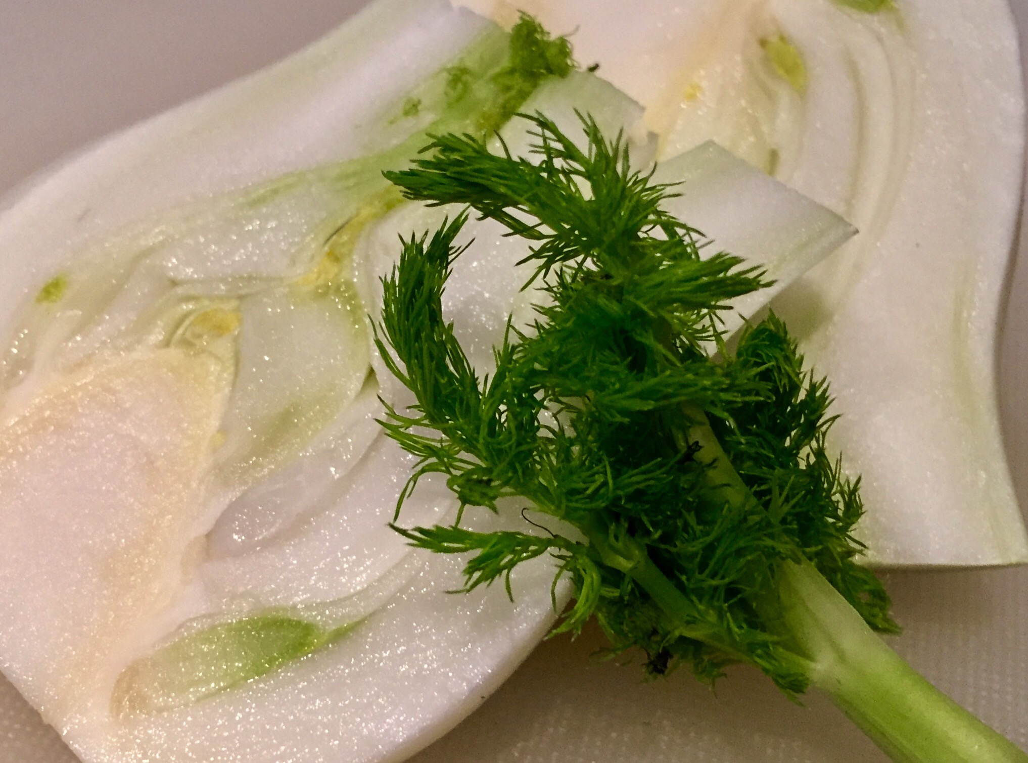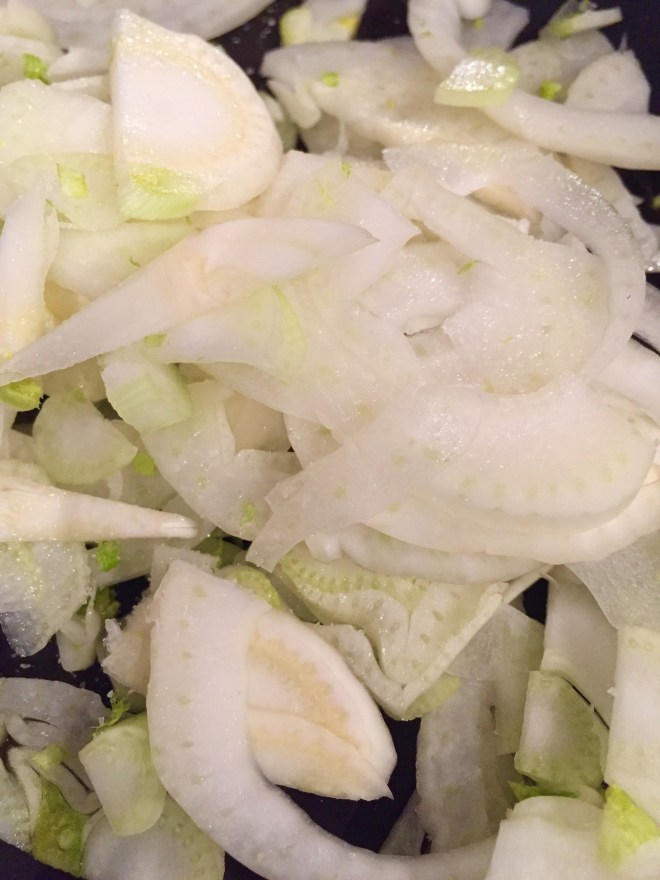 Den Fenchel in dünne Scheiben schneiden, salzen und kurz in etwas Olivenöl dünsten. Er muss noch bissfest sein.