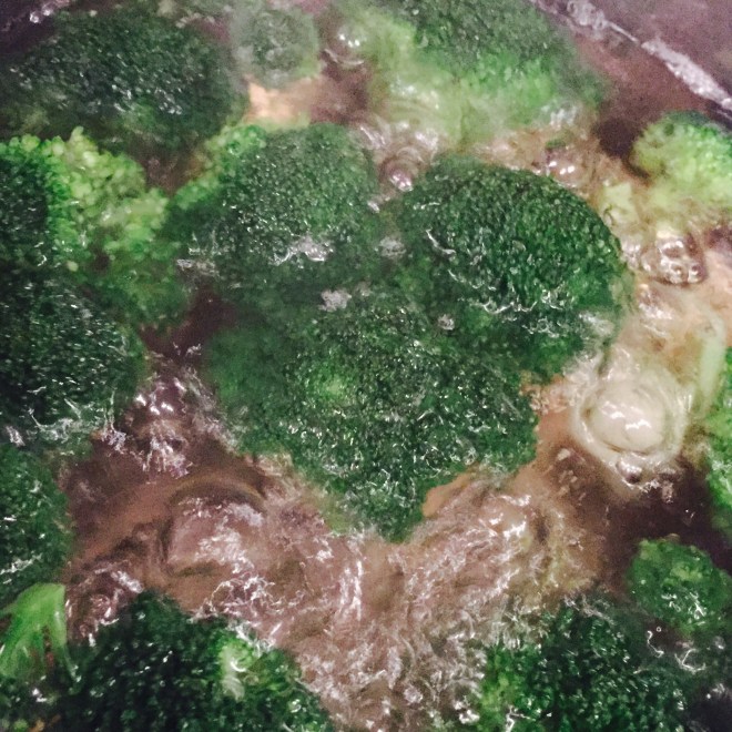 Die Röschen des Broccoli trennen und in reichlich kochendem Wasser ebenso bissfest garen.