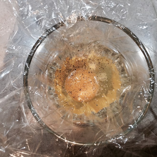 Etwas Klarsichtfolie so in ein leeres Glas/Tasse geben, damit sich eine Mulde bildet und mit einigen Trofen Olivenöl bestreichen.