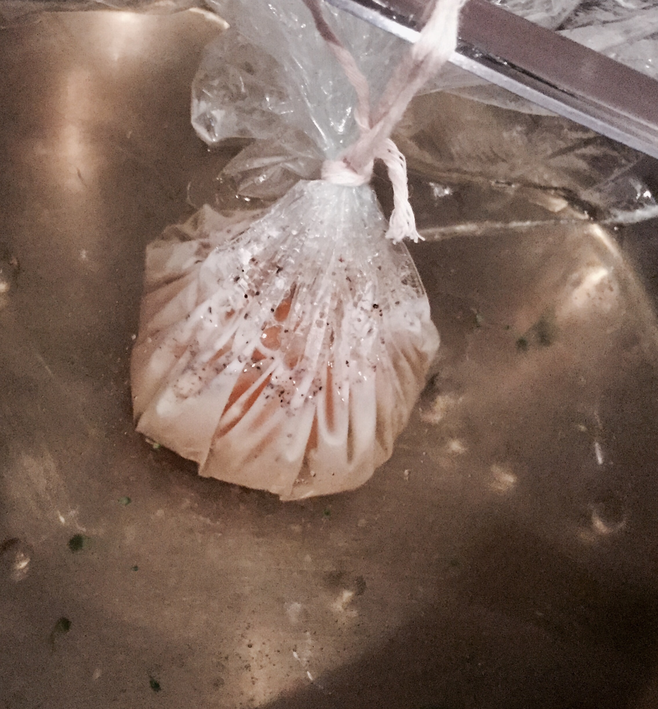 Das Ei öffnen und in die Mulde geben. Salzen und pfeffern und mit etwas Küchengarn schliessen.