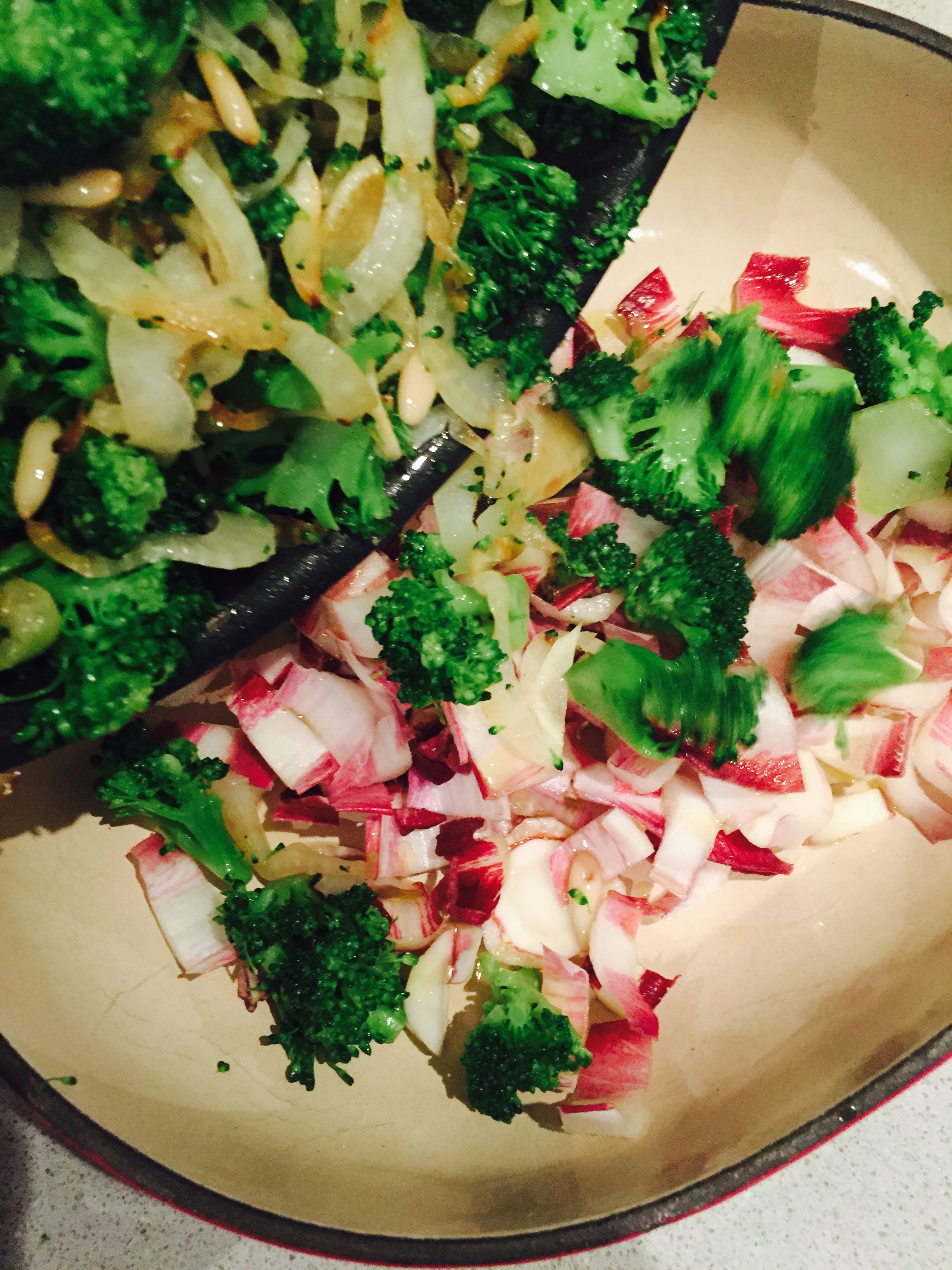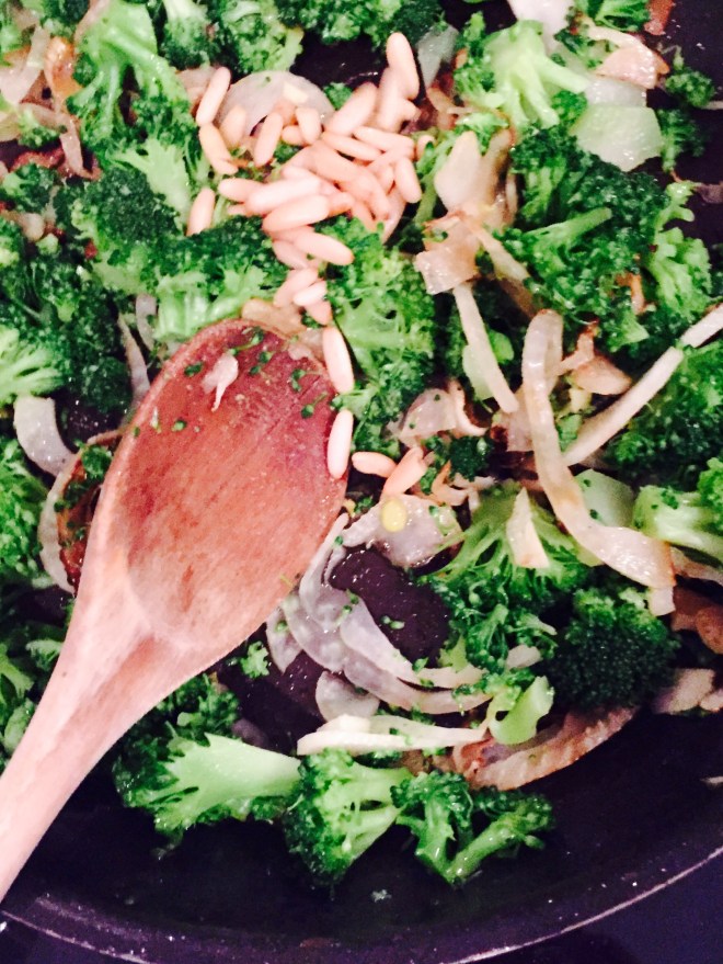 Die Röschen zu dem Fenchel geben und mit den Pinienkernen in der Pfanne schwenken.