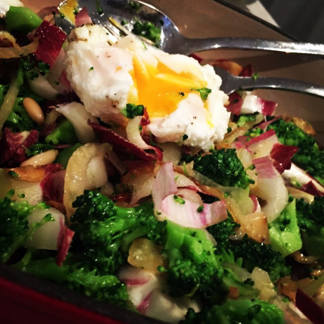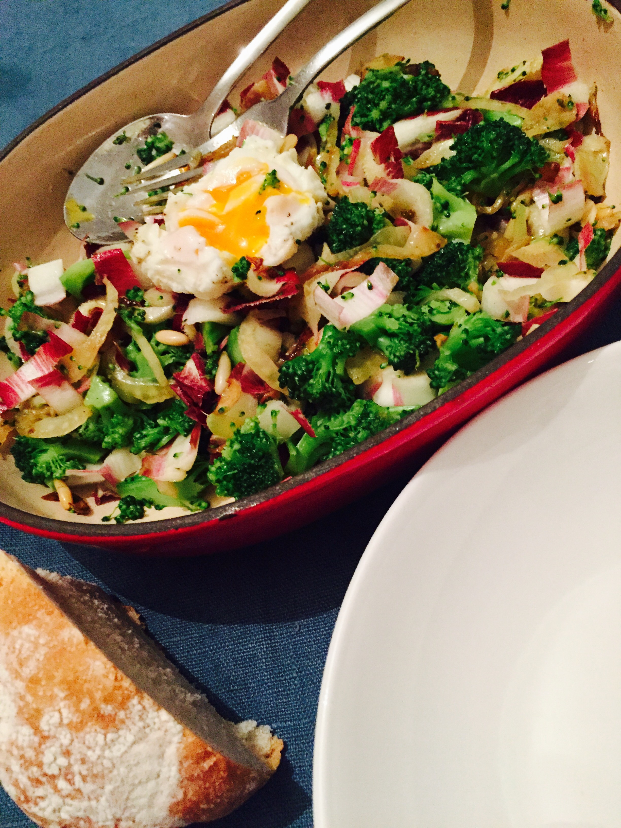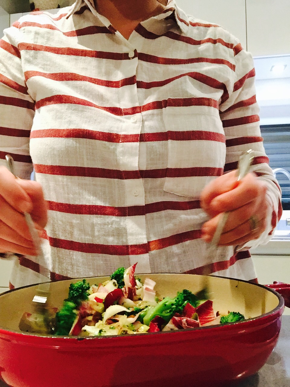Das warme Gemüse mit dem Chicorée mischen und mit etwas Olivenöl und Salz verfeinern.