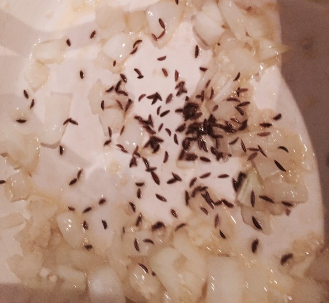 Zwiebel klein schneiden, Knoblauch zerdrücken und mit etwas Olivenöl andünsten. Nach einander die Gewürze (Kümmel, Kurkuma, Garam Masala und den Rosenpaprika) dazugeben und etwas mitrösten.