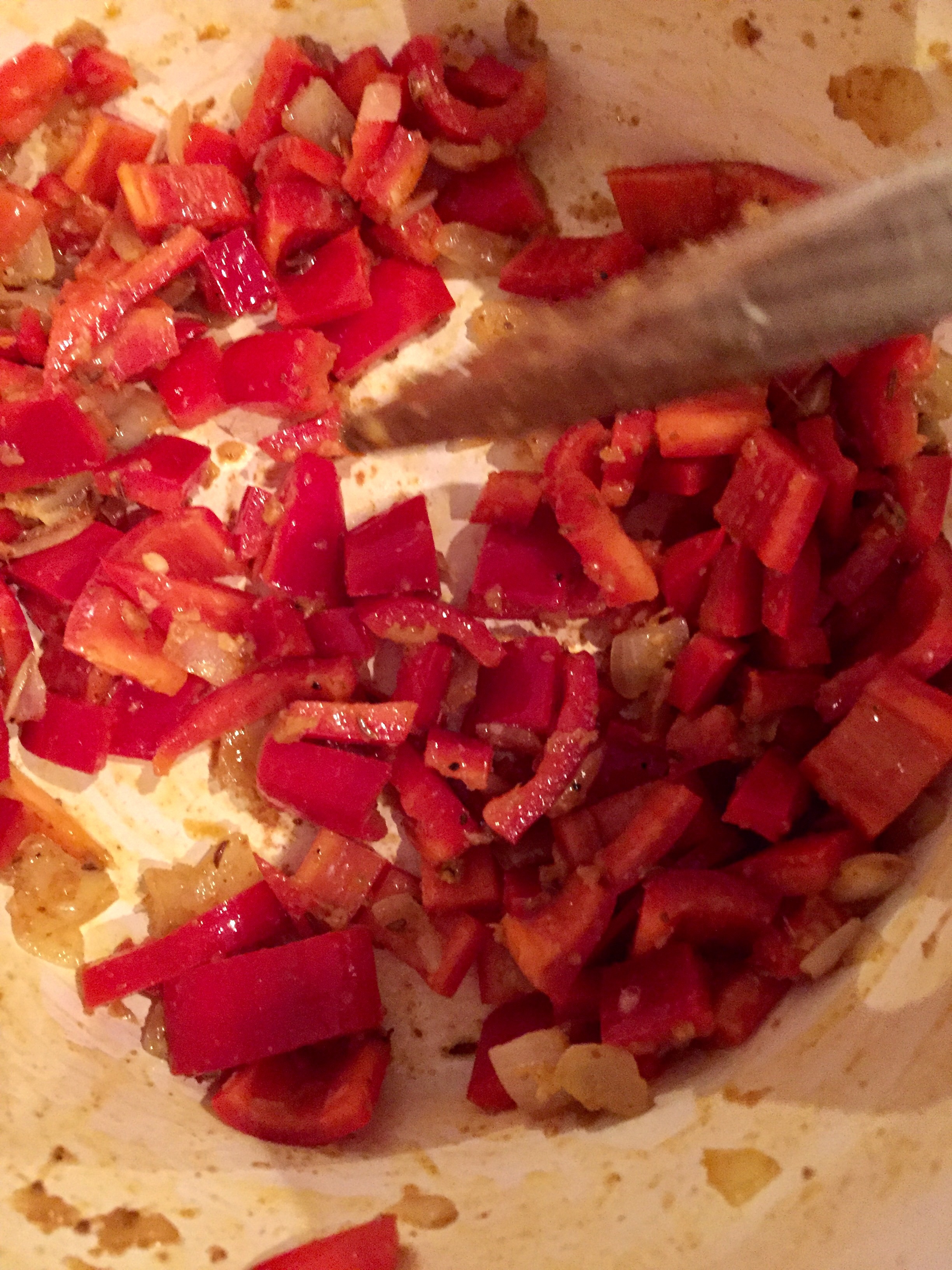 Den Spitzpaprika würfeln, einige Minuten mitdünsten anschliessend die Linsen dazugeben.