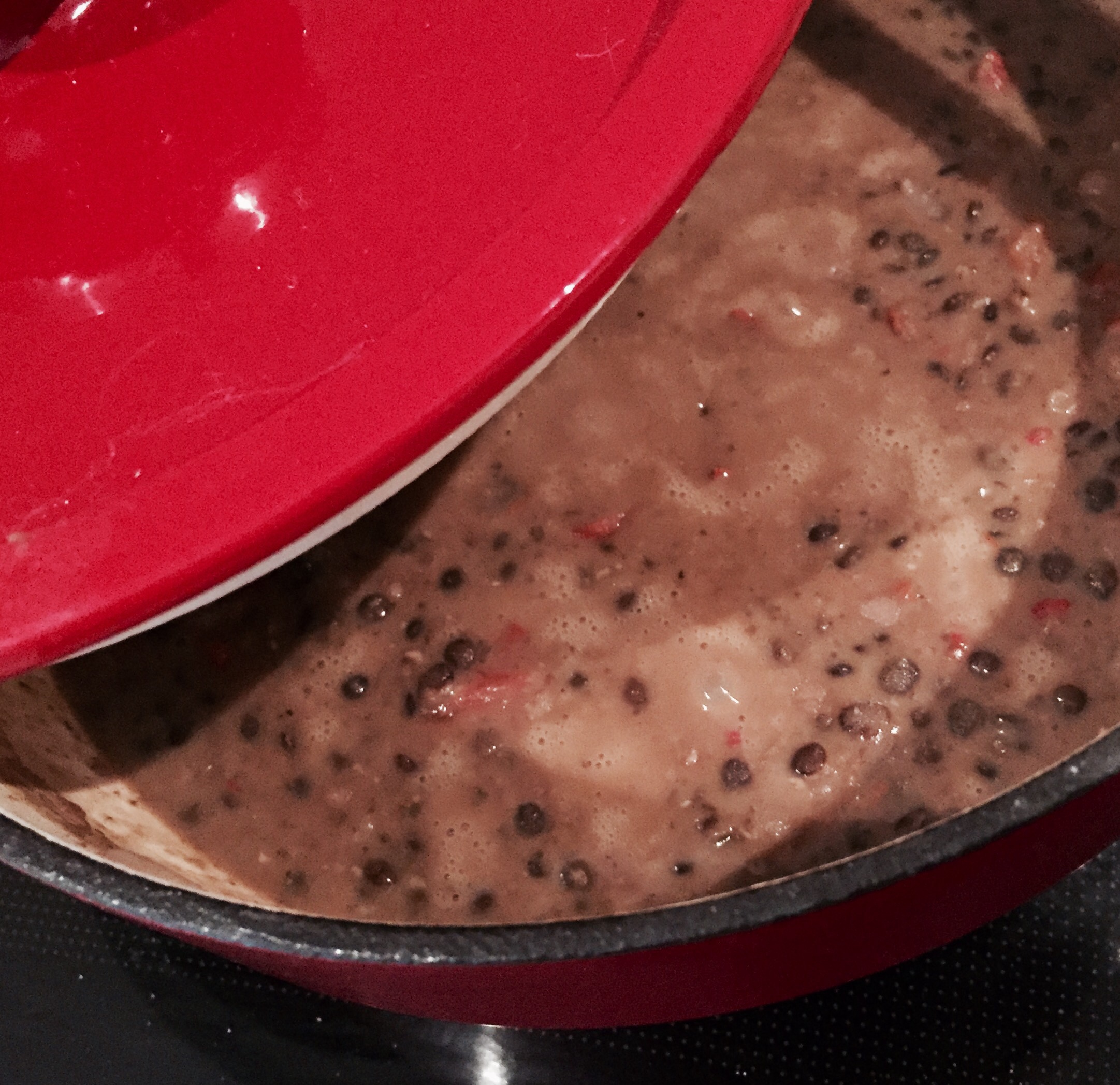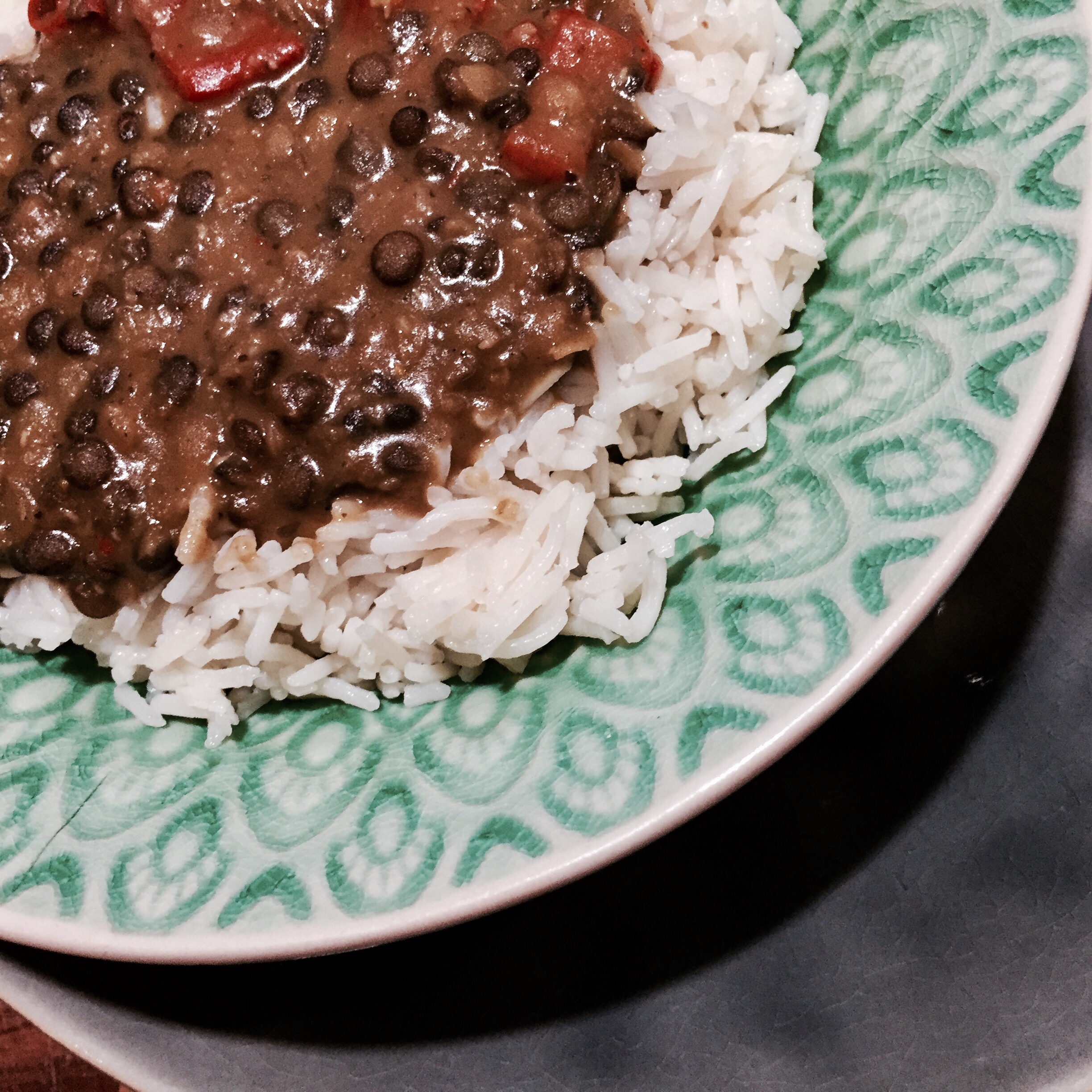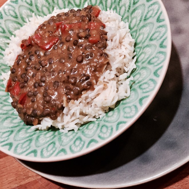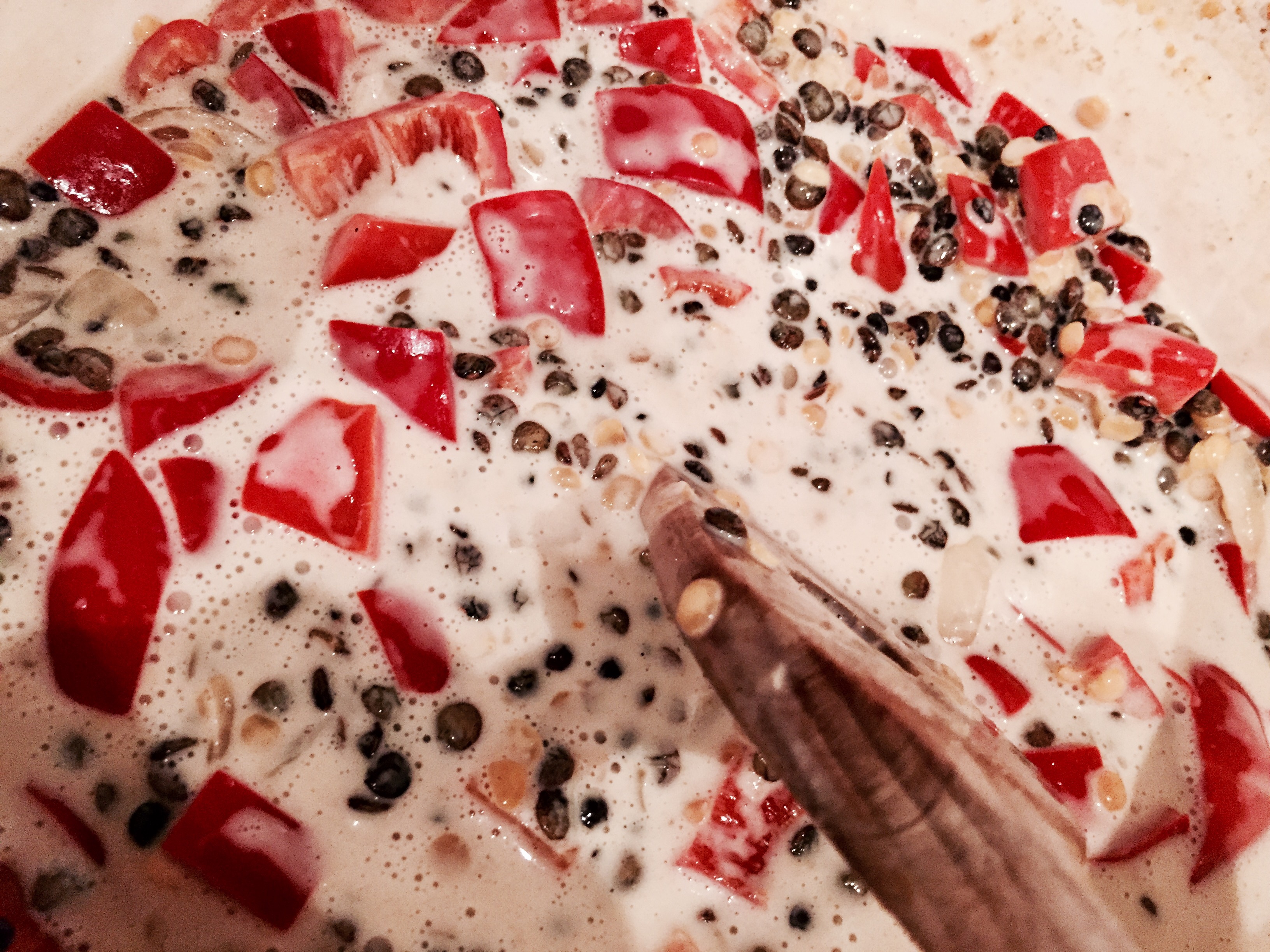 Die Kokosmilch und die Brühe zugiessen und solange kochen bis die Linsen gar sind, eventuell noch etwas Flüssigkeit dazugeben.