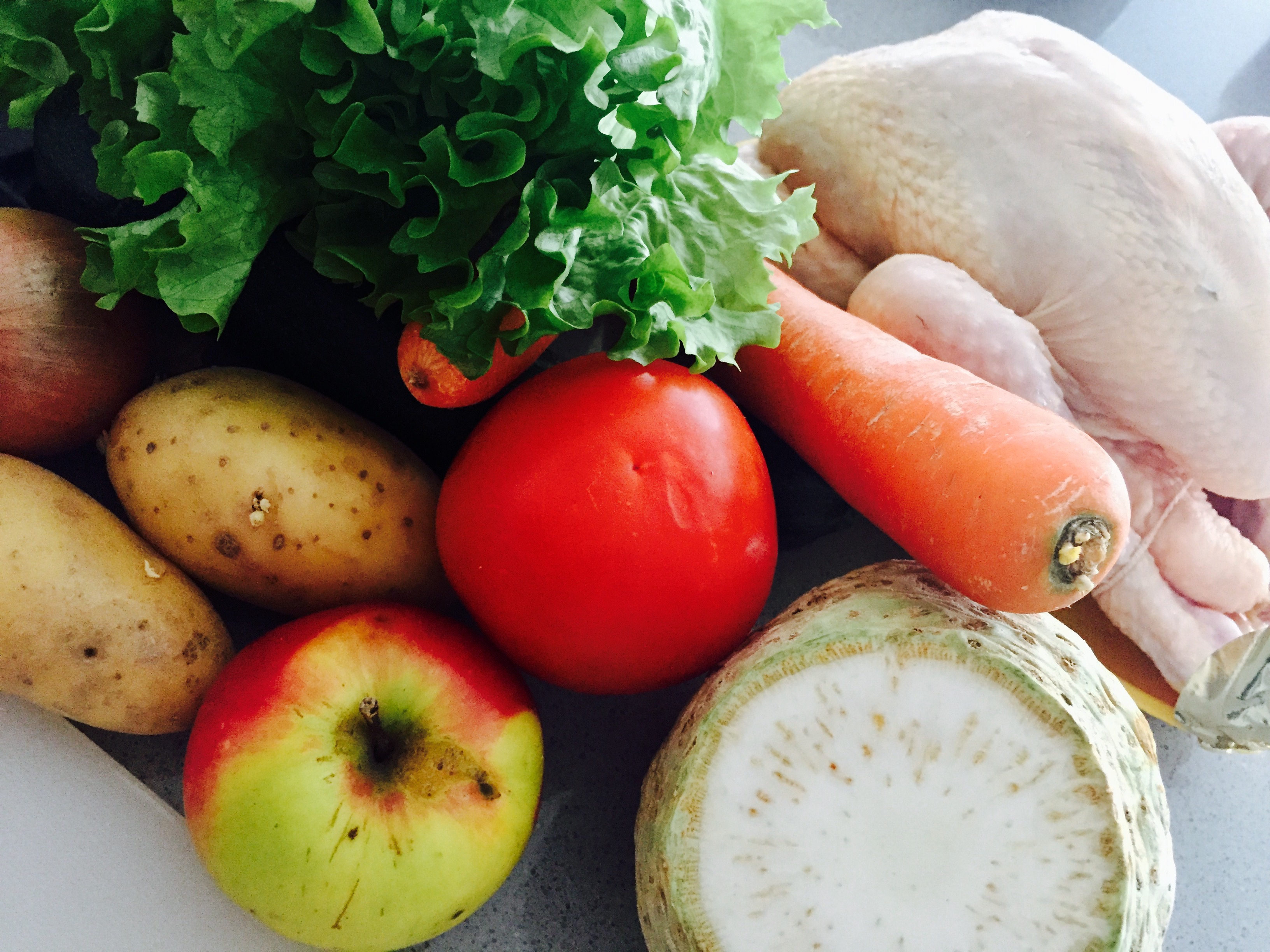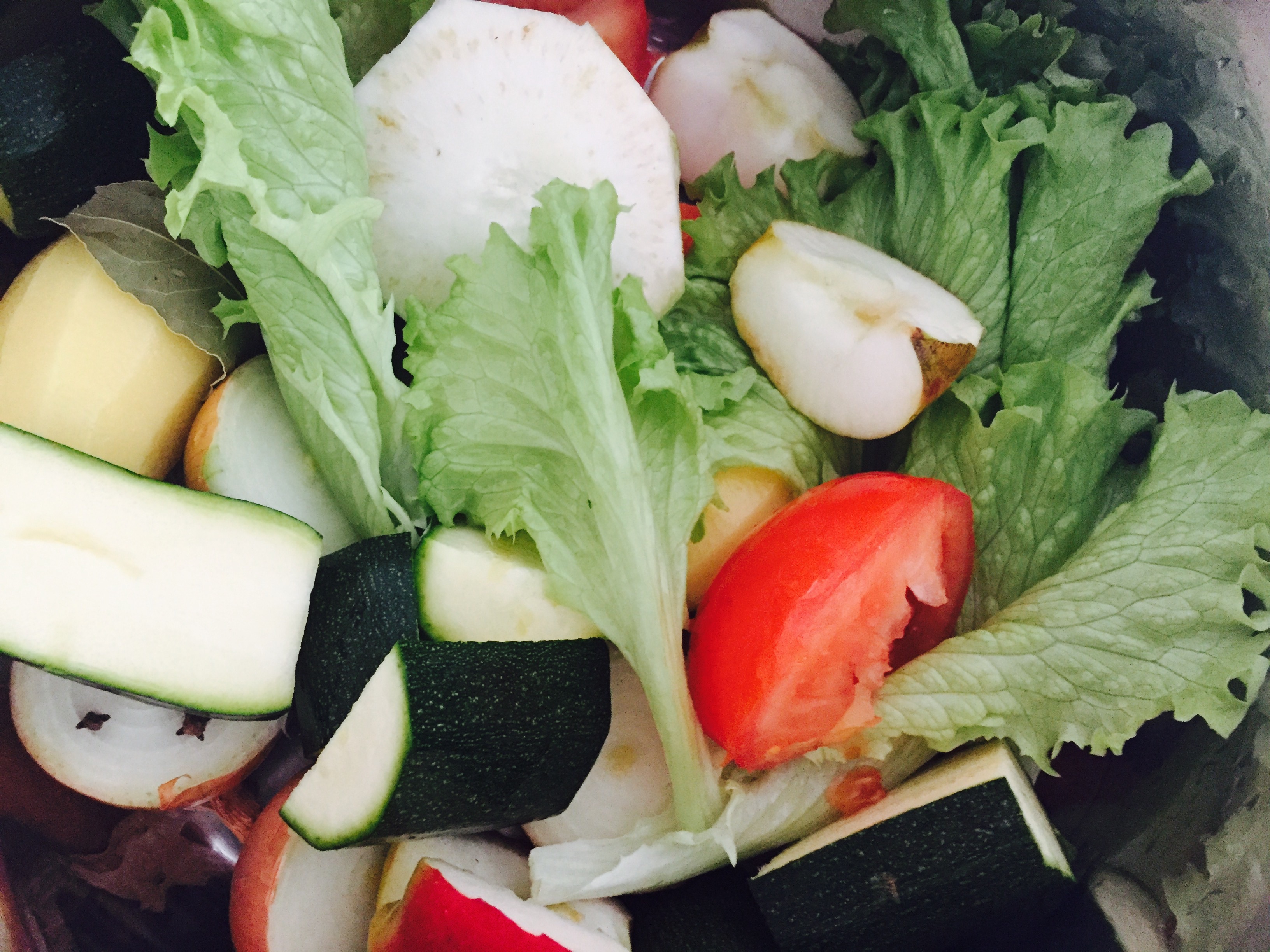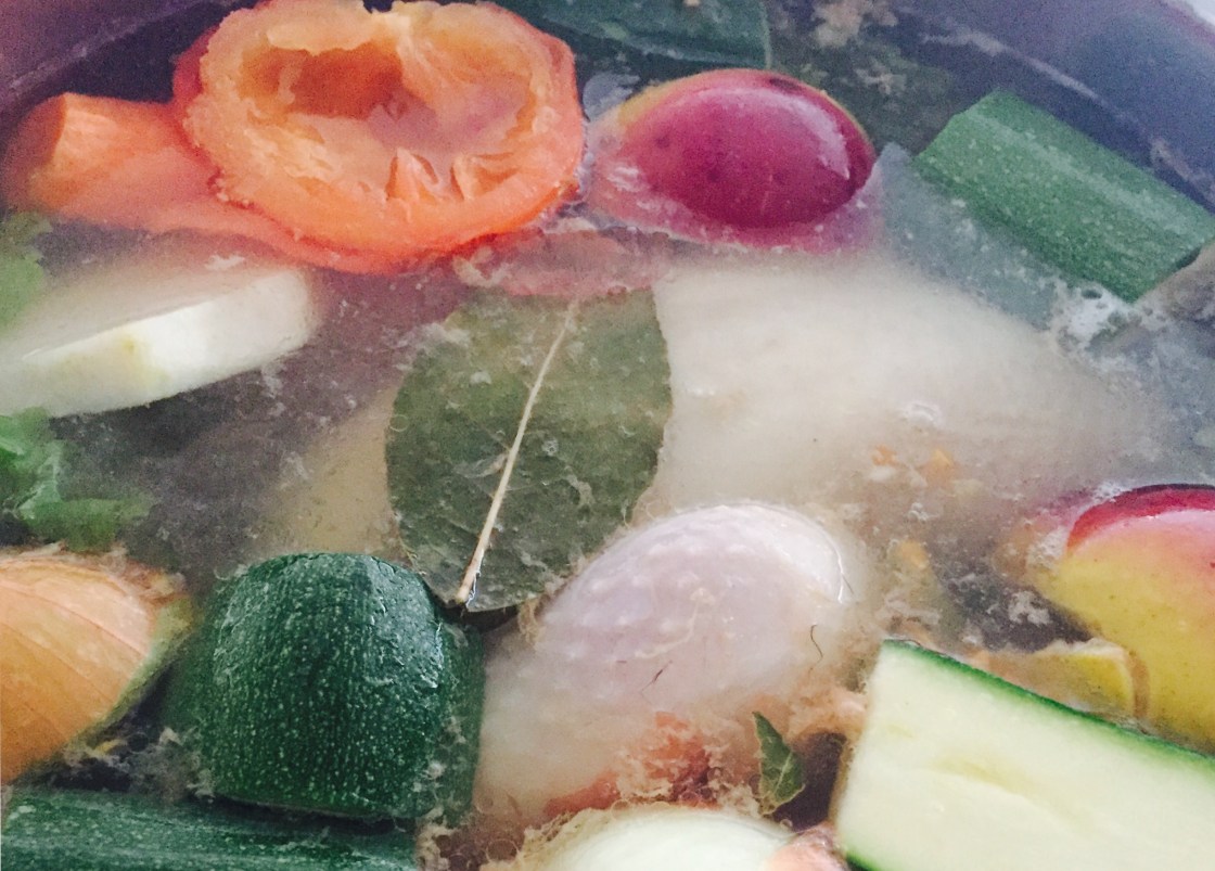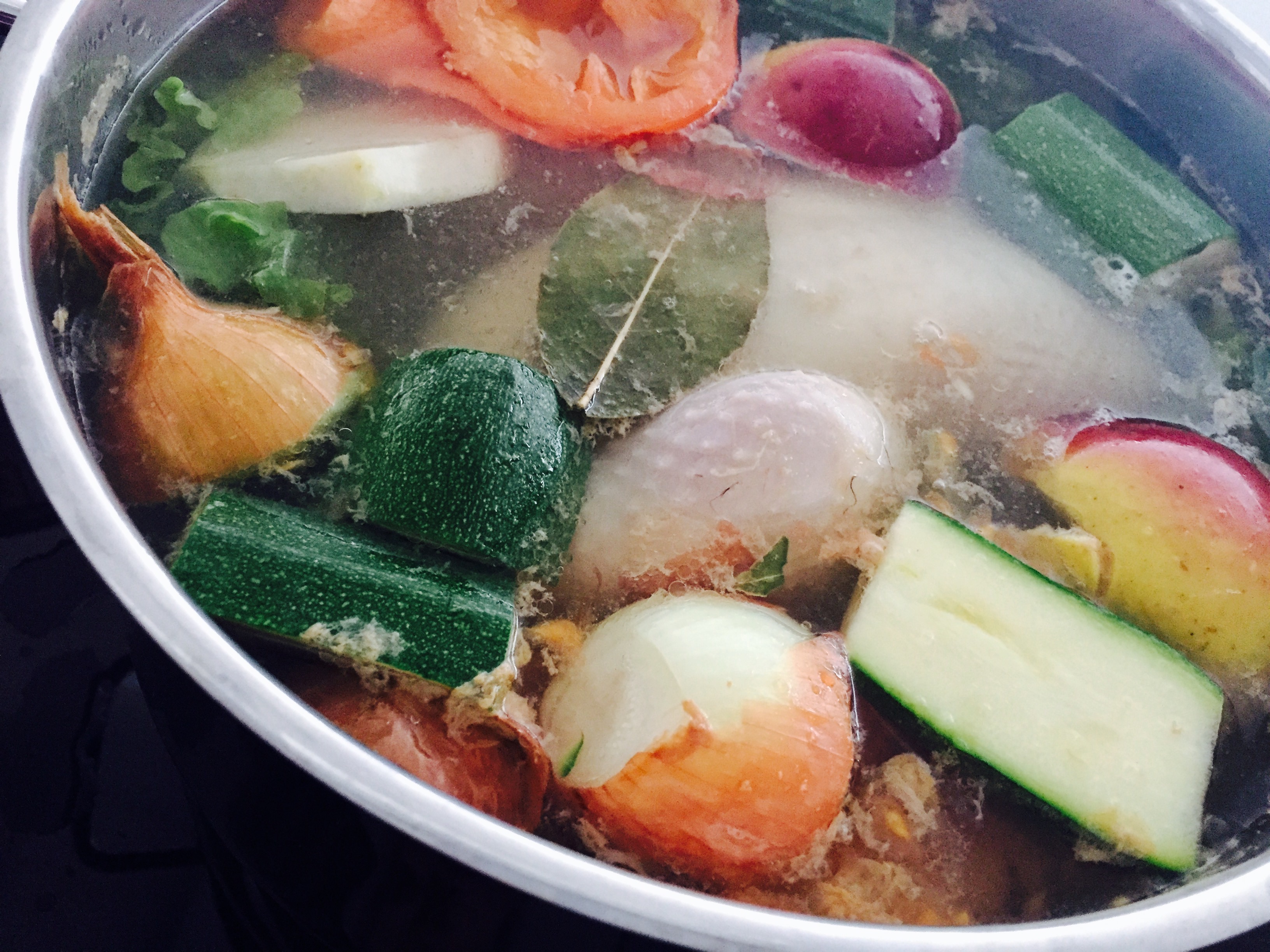 2 kleine Zwiebel mit 3 Nelken gespickt, 2 Karotten, 1 Stück Knollensellerie, 1 Zucchini, einige grüne Salatblätter, 2 kleine Bioäpfel, 2 kleine Kartoffeln und 1 Rispentomate und 1 Lorbeerblatt