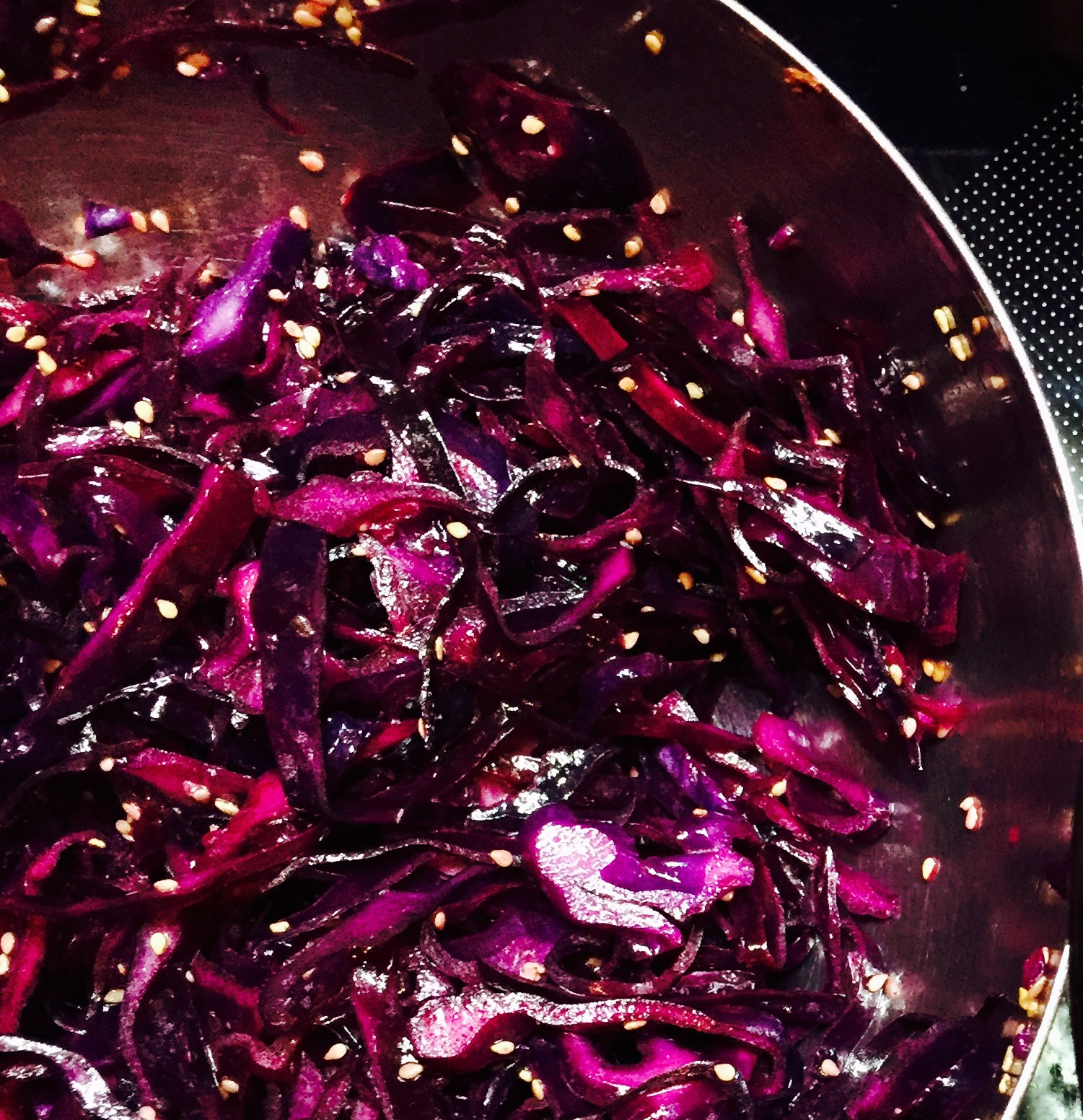Den Rotkohl in sehr feine Streifen schneiden und zusammen mit dem Olivenöl, wenig Salz (das Dressing enthaltet Sojasauce, welche auch noch würze gibt) und einer gepressten Knoblauchzehe in einer Pfanne 10 Minuten dünsten.