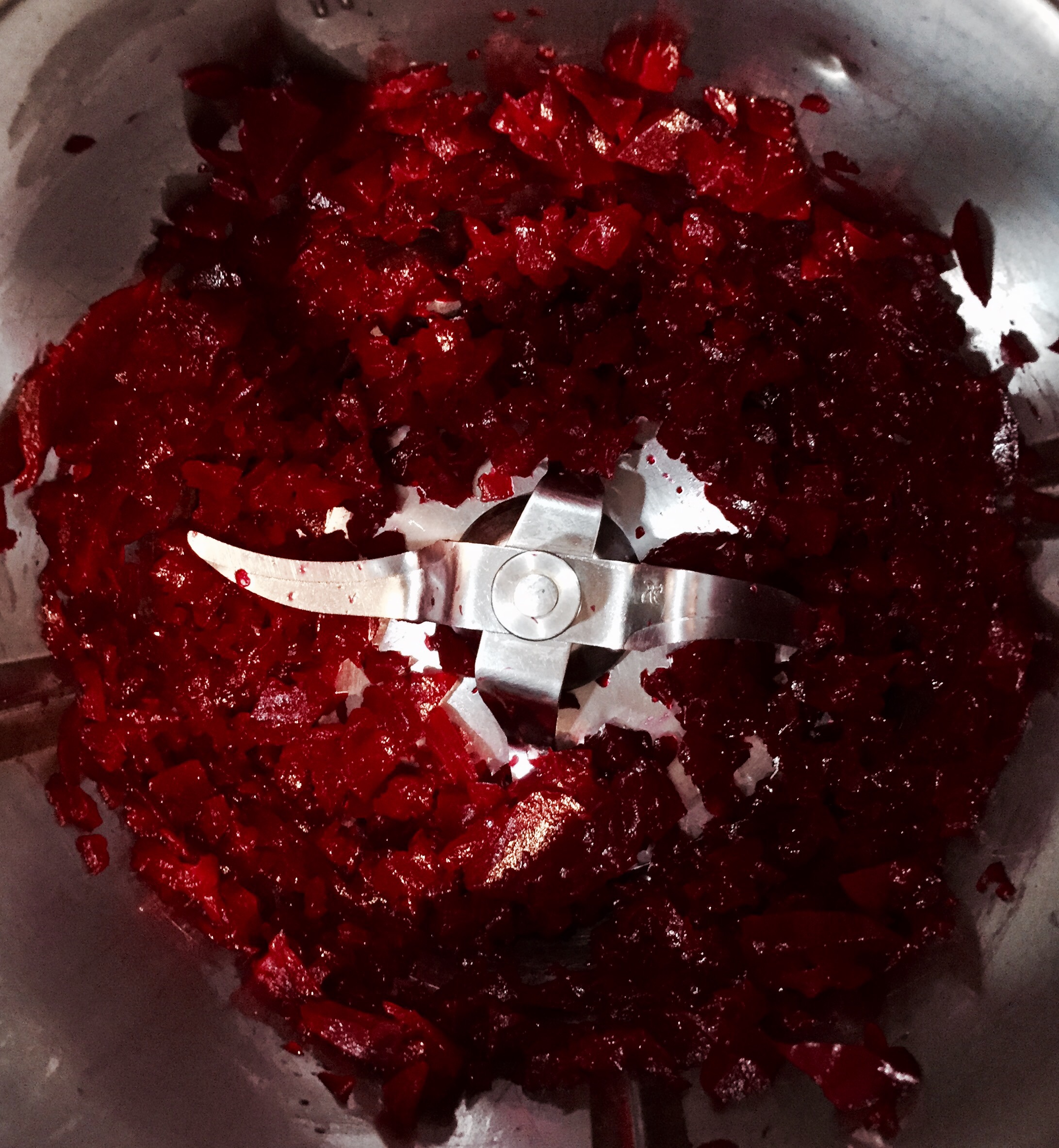 Die Rote Beete in einem Mixer kurz mixen, dabei darauf achten, dass es kein Püree wird.