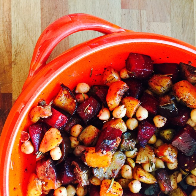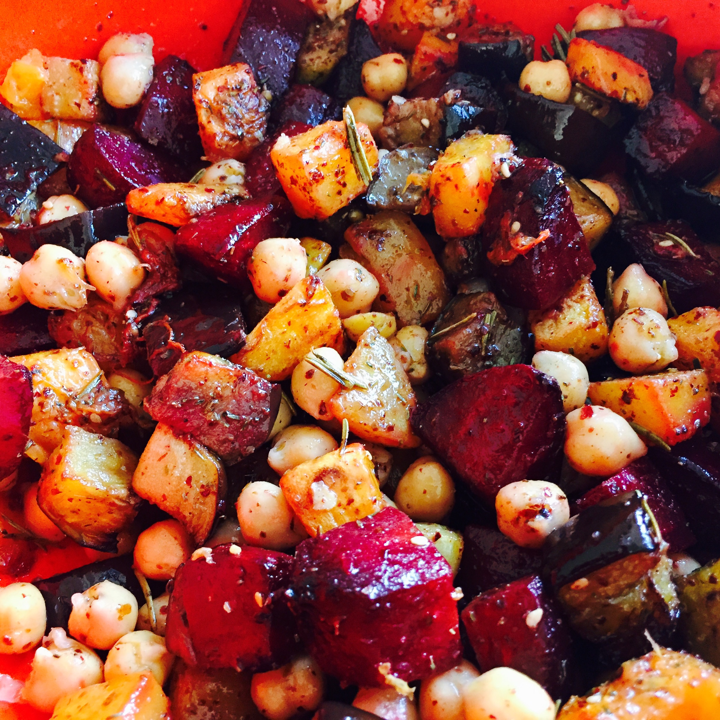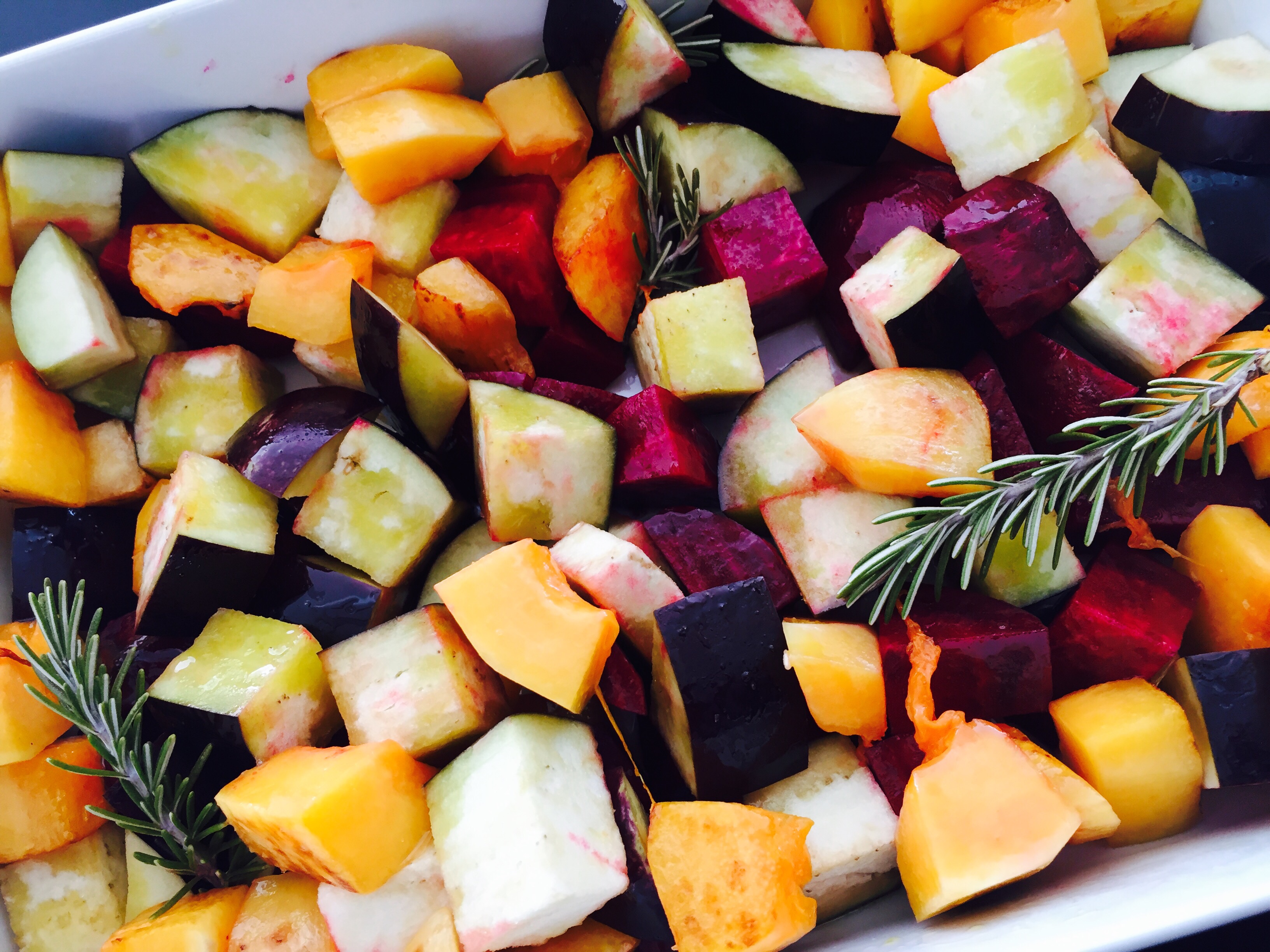 In der Zwischenzeit auch die Aubergine in Stücke schneiden und zusammen mit der roten Beete und dem Kürbis in eine Ofenform geben. Das Gemüse wenig salzen und mit Olivenöl beträufeln, die Zweiglein Rosmarin darauf verteilen und bei 190 Grad Umluft weich garen.