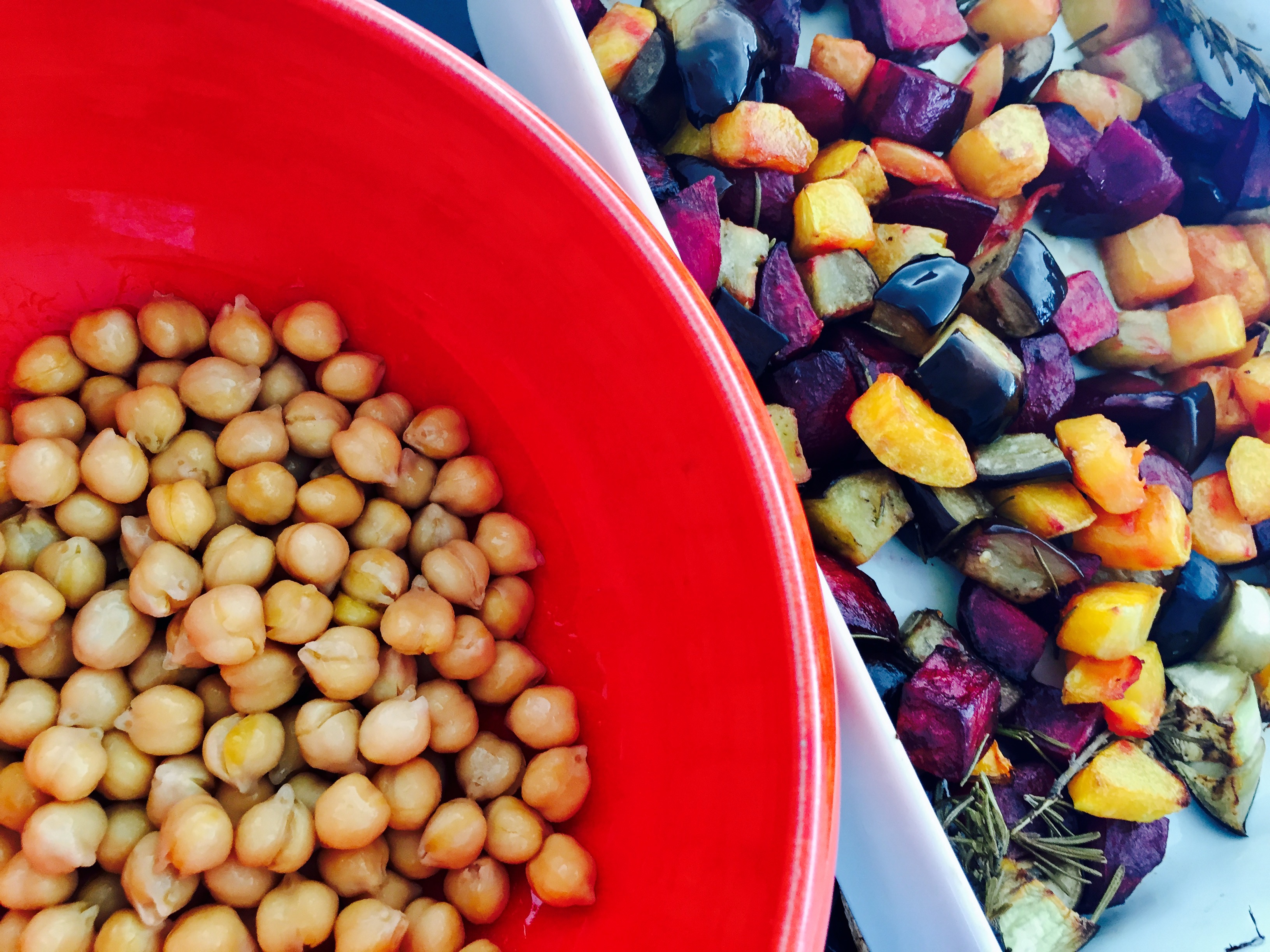 In einer Schüssel die Kichererbsen (die Knoblauchzehe vorher entfernen) und das Gemüse mischen und mit 2 Teelöffel Za’atar, der Zirtonenzeste, einigen Tropfen Essig, Salz und wenig Olivenöl würzen.
