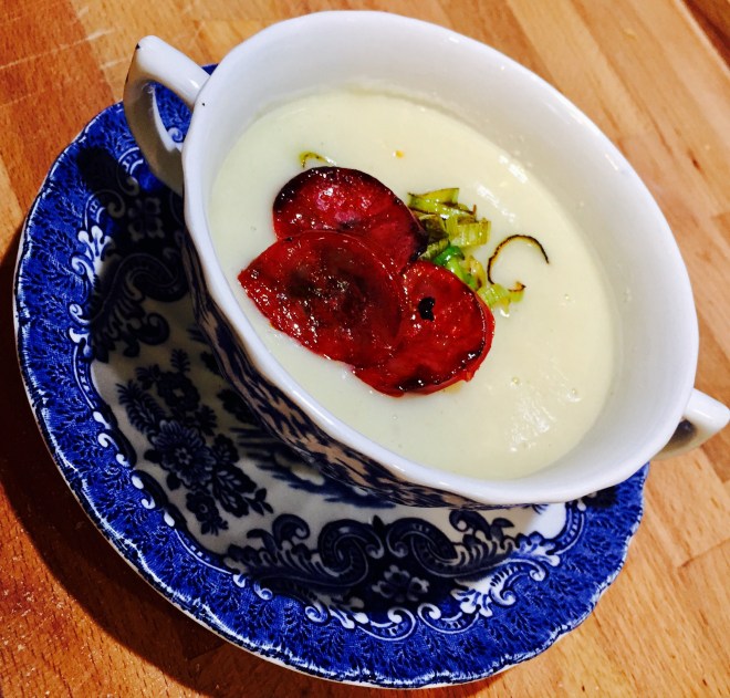 Für die vegetarische Variante die Suppe mit etwas Lauchstroh servieren. Den Lauch dafür in dünne scheiben schneiden und in etwas Olivenöl kurz frittieren.