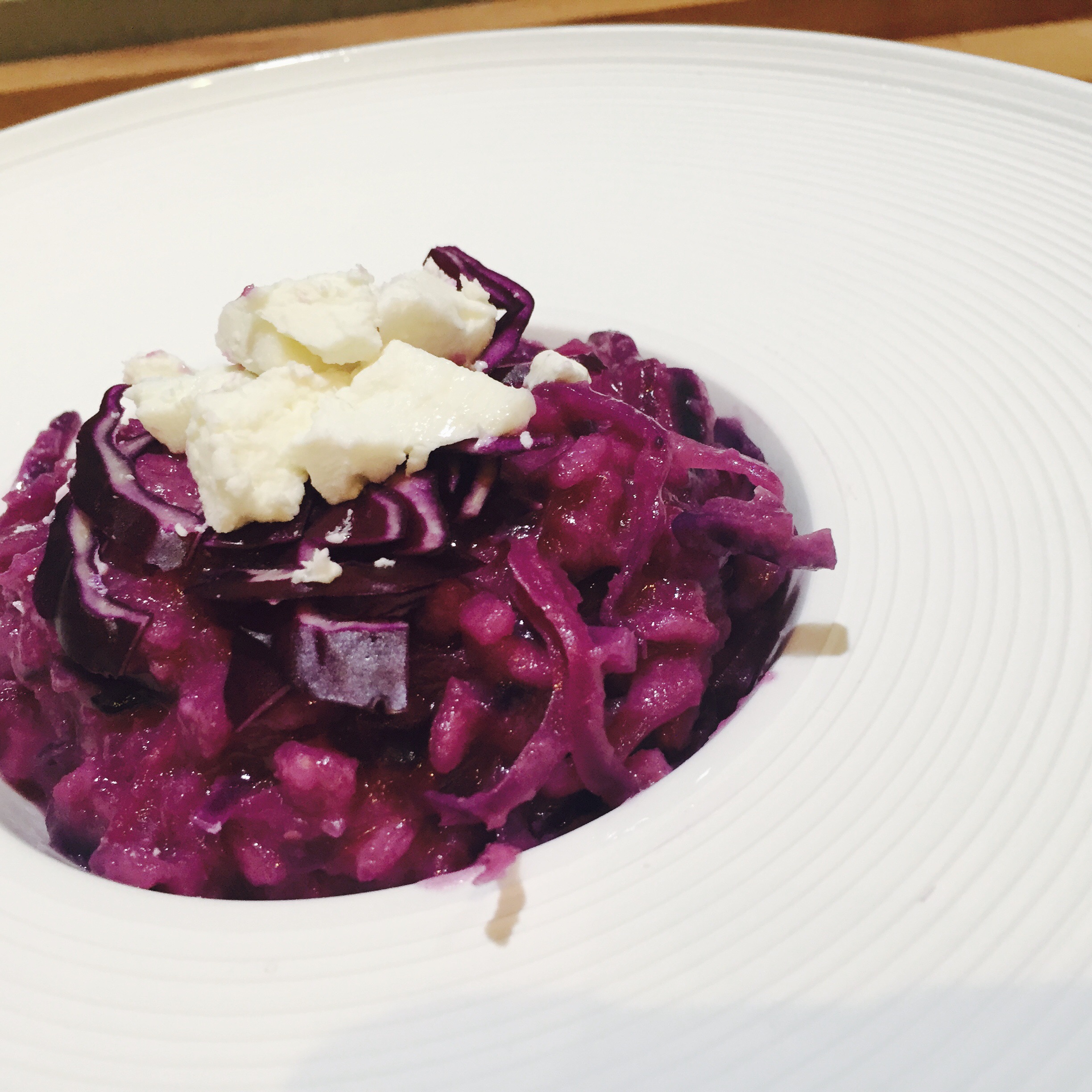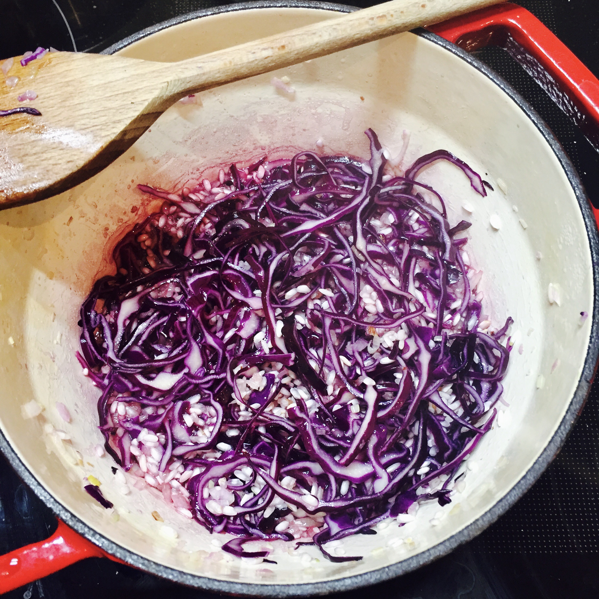 Anschliessend jeweils eine Kelle heisse Brühe und 2 Esslöffel Blaukrautpüree dazugeben und einkochen lassen. So fortfahren bis der Risotto gar ist. Nach 10 Minuten dein geschälten und gewürfelten Apfel dazugeben und mitkochen.