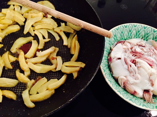 Daraufhin die Sardellenfilets in etwas Olivenöl schmelzen, dann zuerst die Artischokenherzen darin anbraten und anschliessend die Seppie dazugeben.