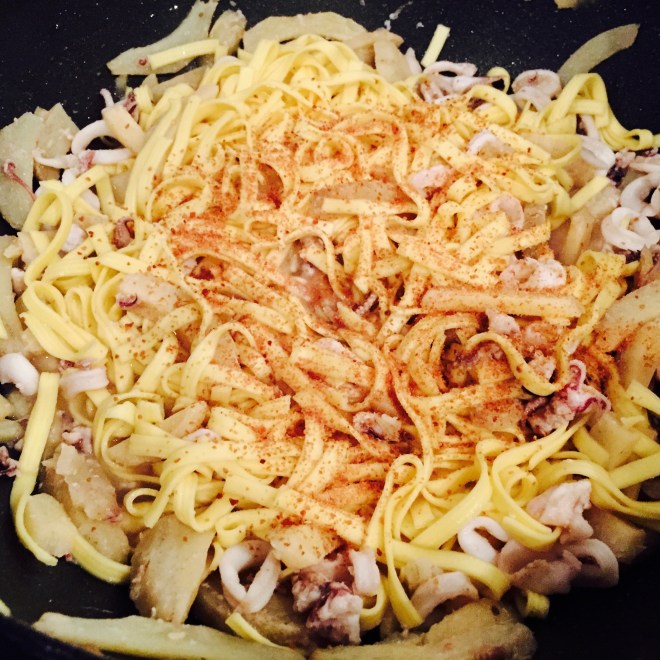 Zugedeckt 5 Minuten köcheln. Die Seppie verlieren sehr viel Wasser, dieses in der Pfanne lassen und nicht einkochen lassen, das verhindert das die Riccioli pampig werden.