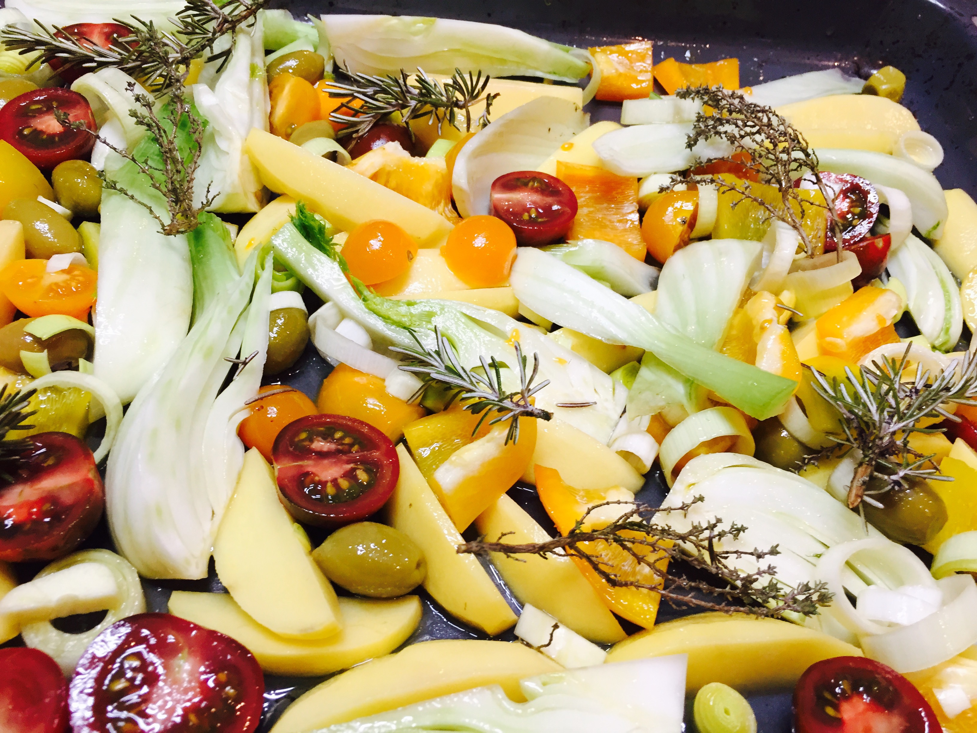 Die Fenchelknolle in Spalten, die Paprika in Würfel, den Lauch in Streifen und die Tomaten in Hälften schneiden. Die Kartoffel schälen und ebenso in Spalten schneiden. Das ganze Gemüse mit den Oliven und den Rosmarin sowie dem Thymian auf ein Backblech geben mit Olivenöl beträufeln, salzen, gut mischen.