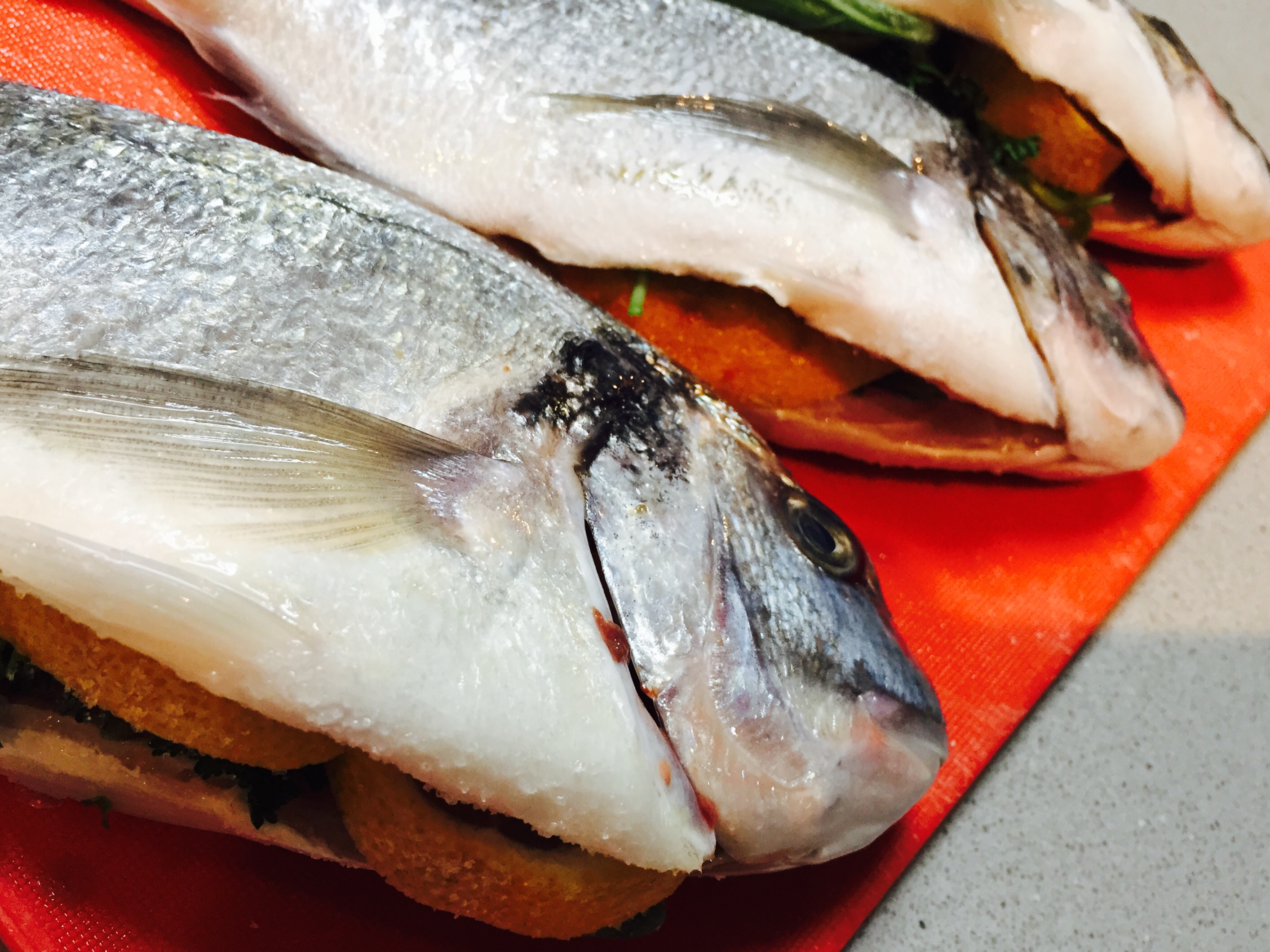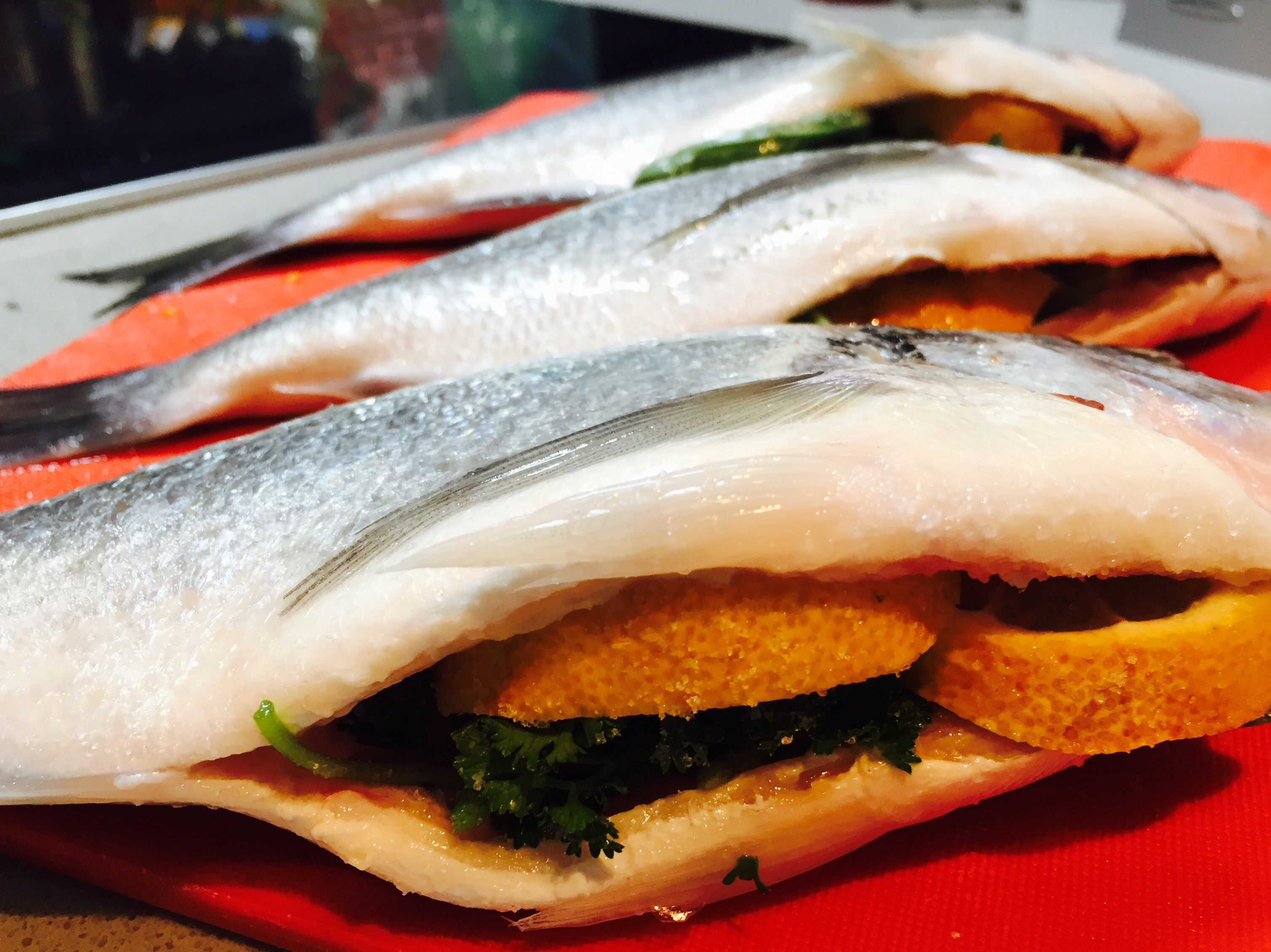 In der Zwischenzeit die küchenfertigen Doraden mit kaltem Wasser spülen und trocken tupfen. Das Basilikum, die Petersilie und 2 Scheiben Zitrone in die Bauchhöhle geben und die Dorade innen und aussen salzen.