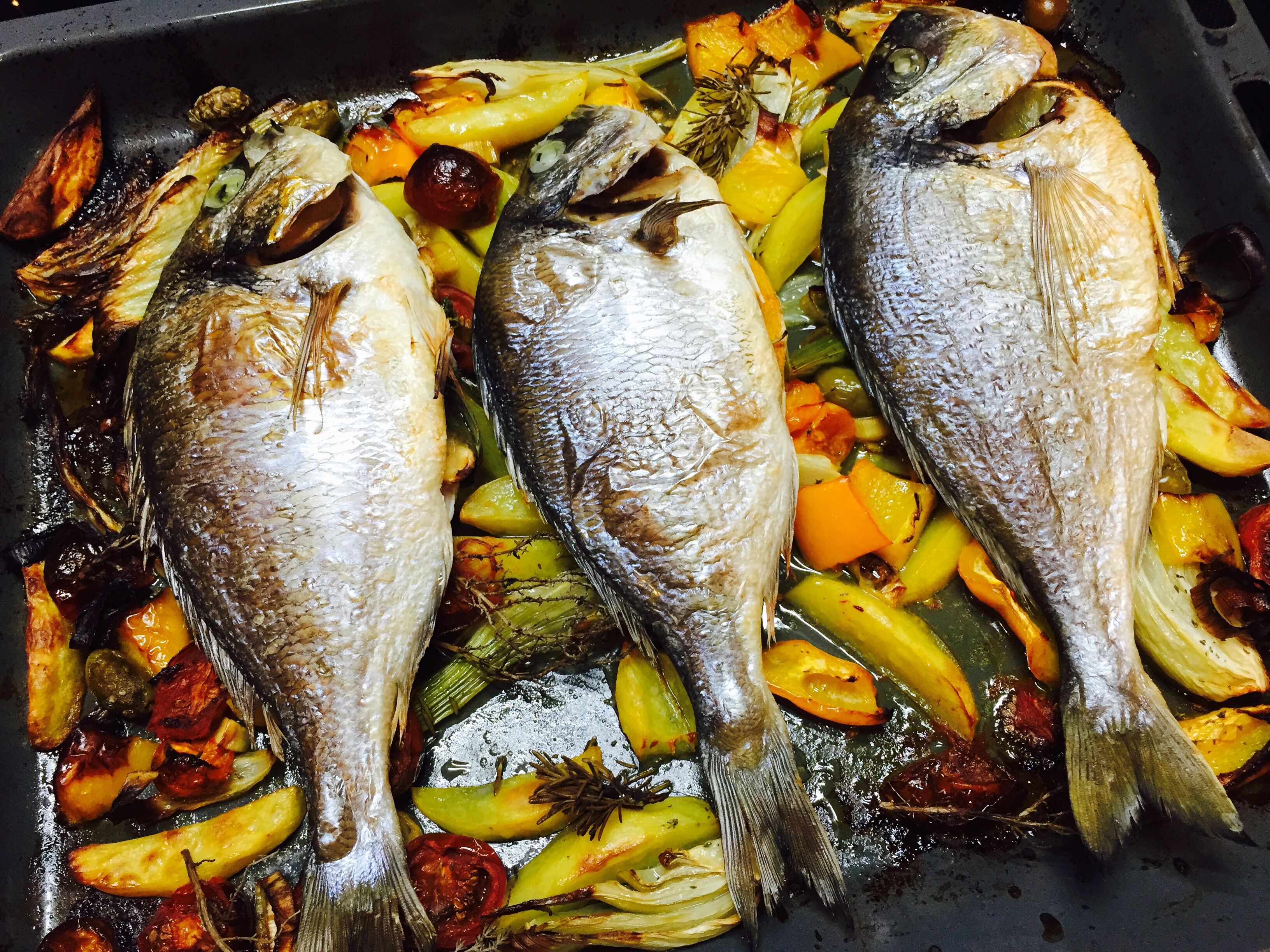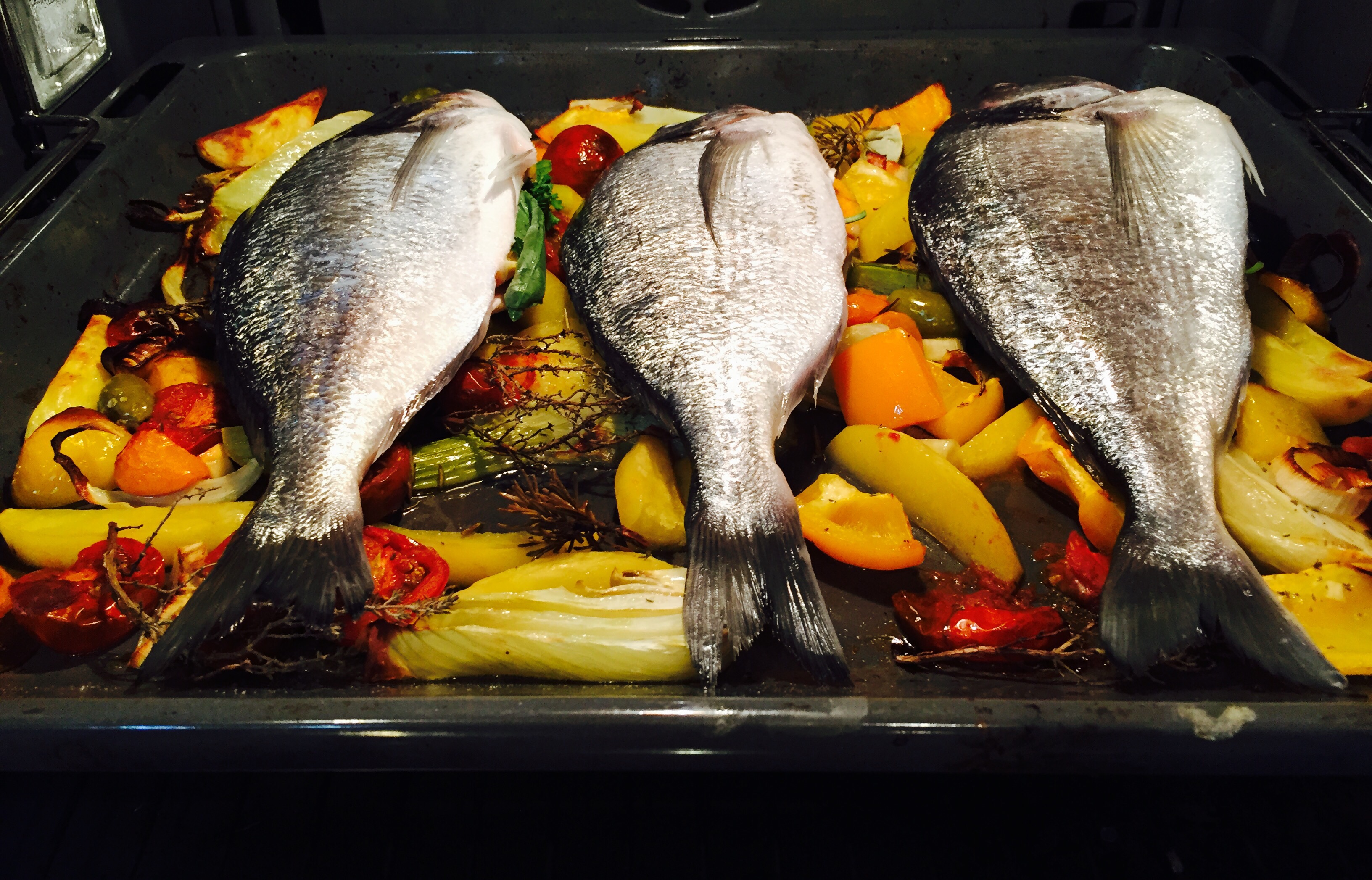 Nach den ersten 20 Minuten die Doraden auf das Gemüse legen, ca. 1 Glas Weisswein angiessen und für weitere 20 Minuten die Doraden garen.