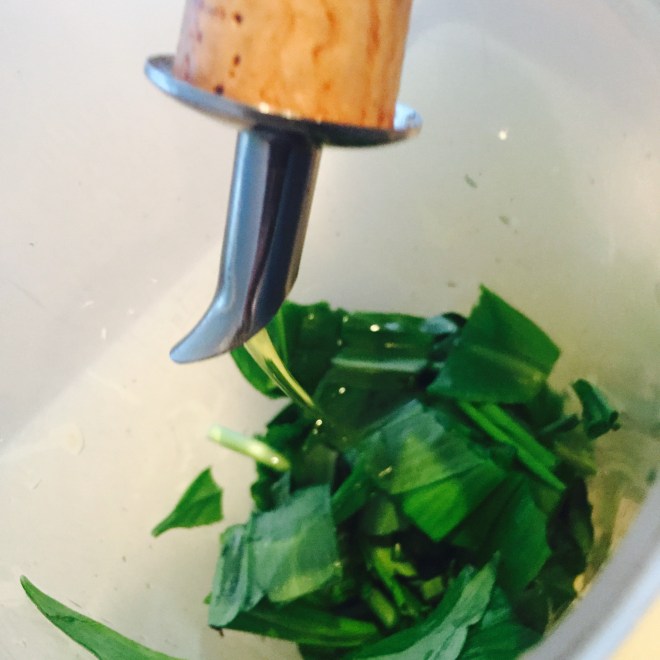 In der Zwischenzeit den Bärlauch waschen, trocknen und mit 2 Esslöffel Olivenöl fein pürieren.