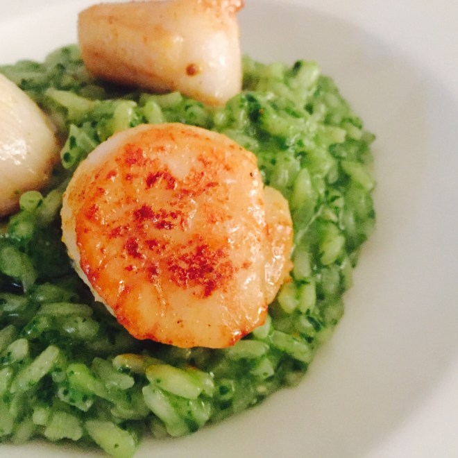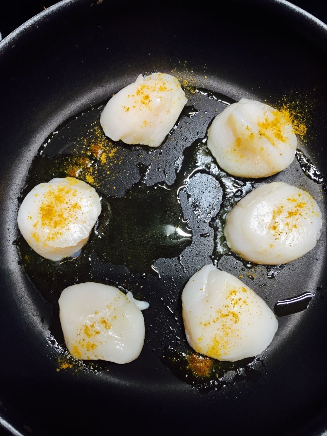 Die Jakobsmuscheln in einer Pfanne mit etwas Salz und Cafè de Paris Gewürz braten.