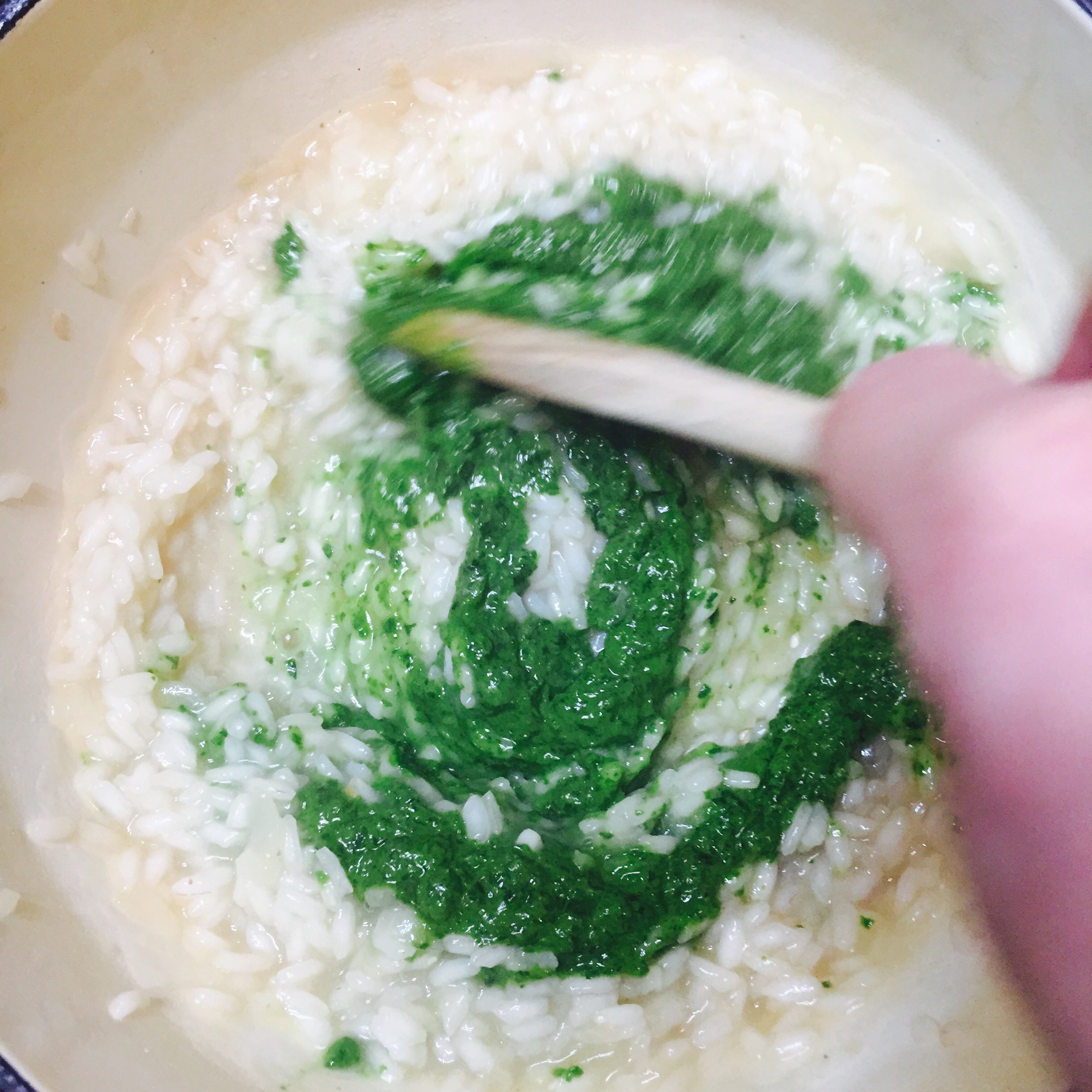 Sobald der Risotto gar ist, den Bärlauchpesto unterrühren und mit etwas Butter und geriebenen Parmigiano verfeinern.