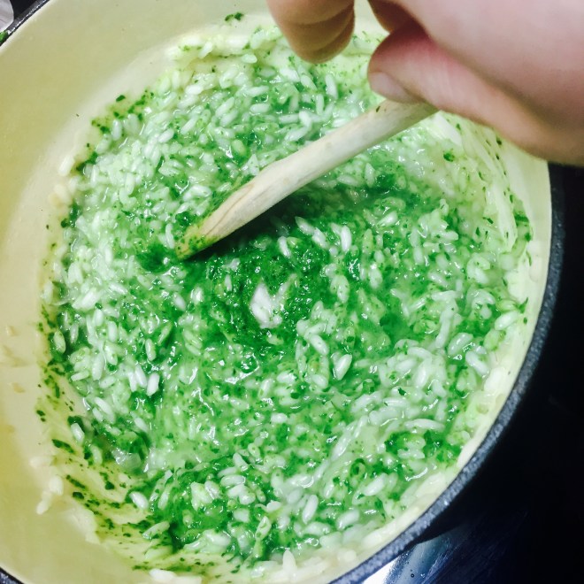 Anschliessend kellenweise die heisse Brühe dazugeben und einkochen lassen bis der Risotto gar ist.