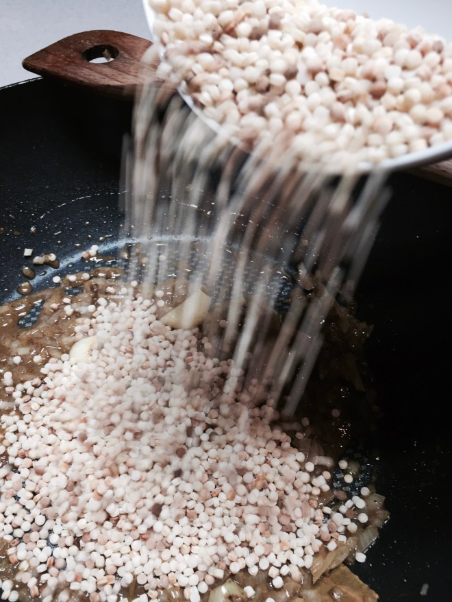 Anschliessend kellenweise die Brühe dazugeben und wie bei einem Risotto verfahren bis die Fregola und die Linsen gar sind, bei mir ca. 20 Minuten.