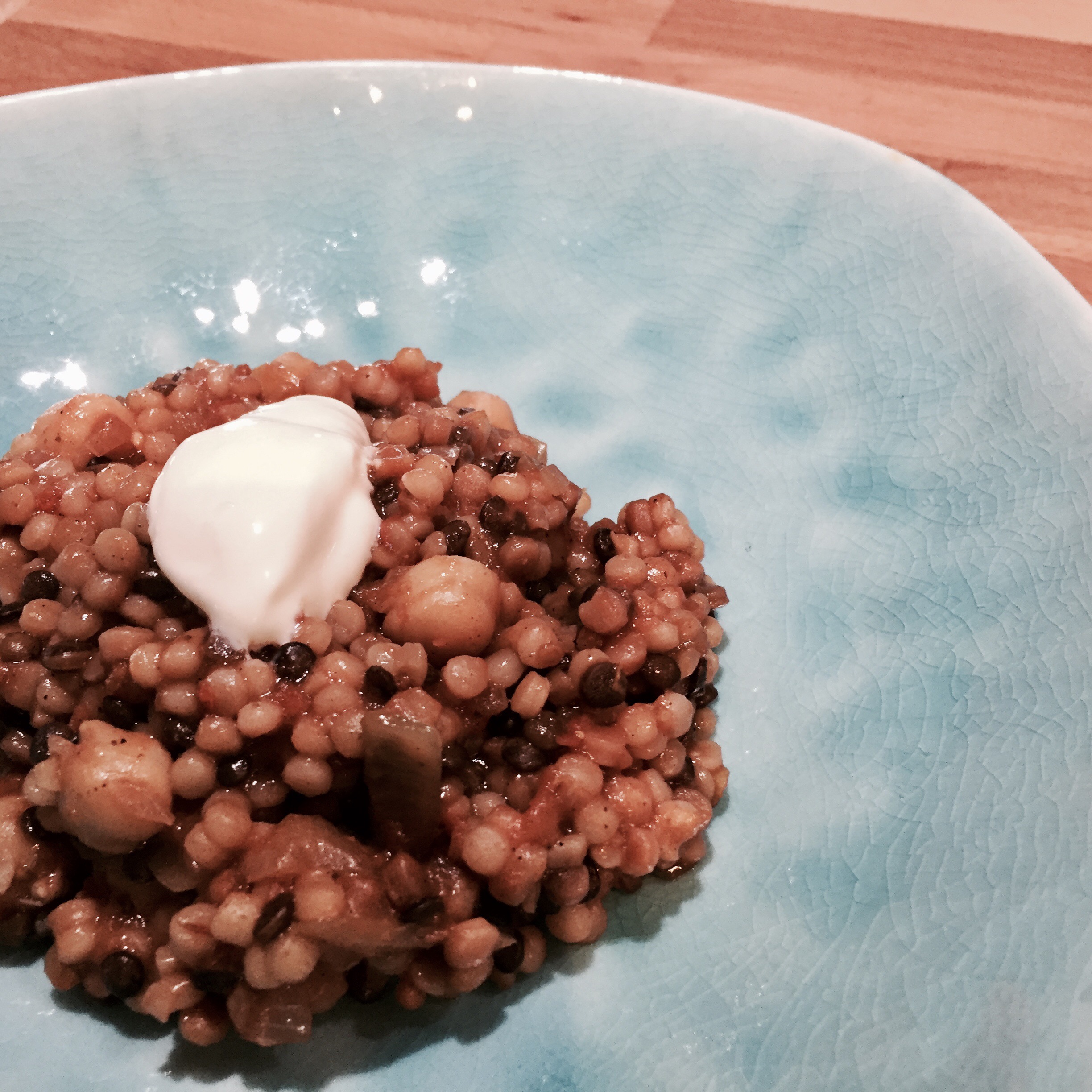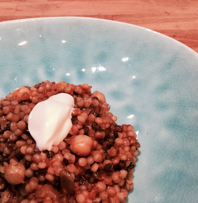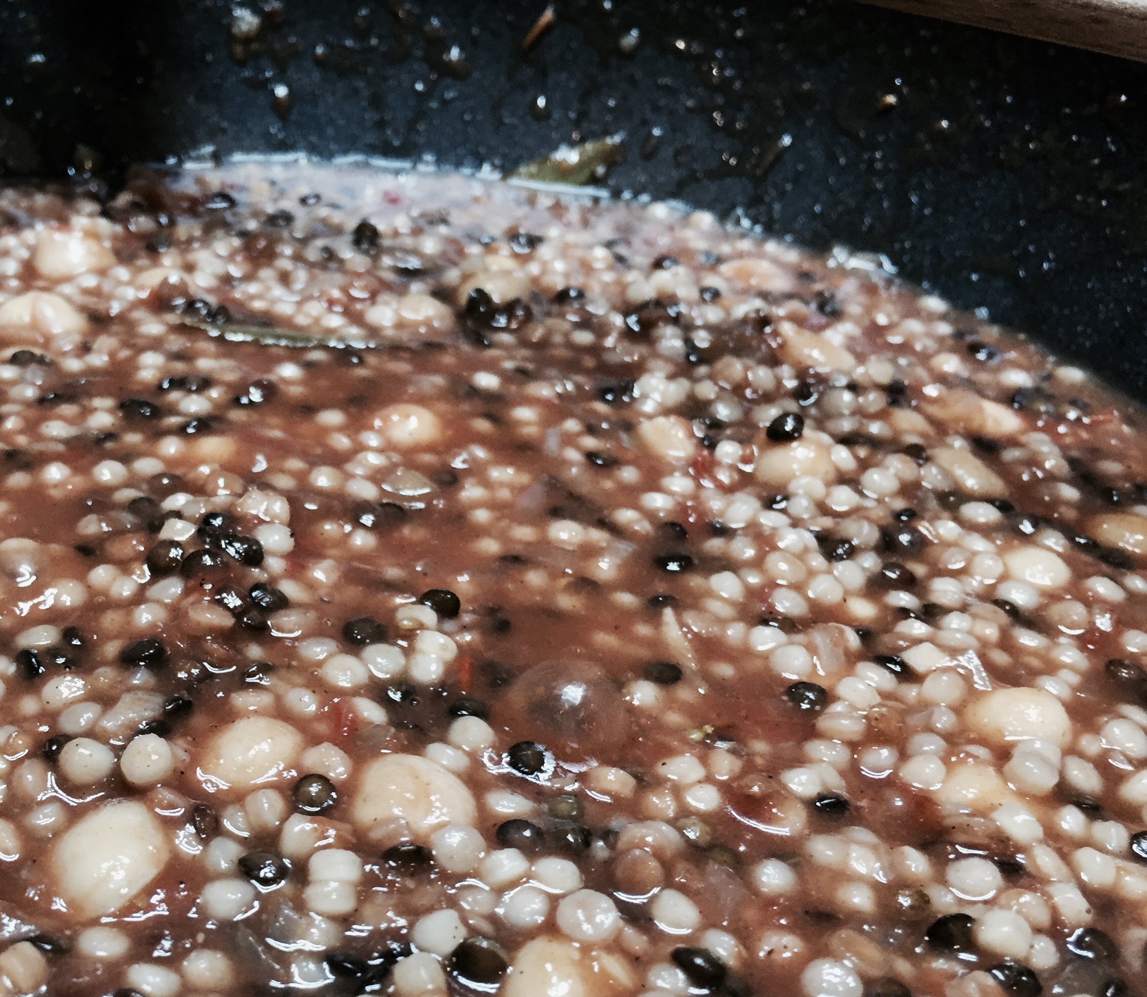 Anschliessend kellenweise die Brühe dazugeben und wie bei einem Risotto verfahren bis die Fregola und die Linsen gar sind, bei mir ca. 20 Minuten.