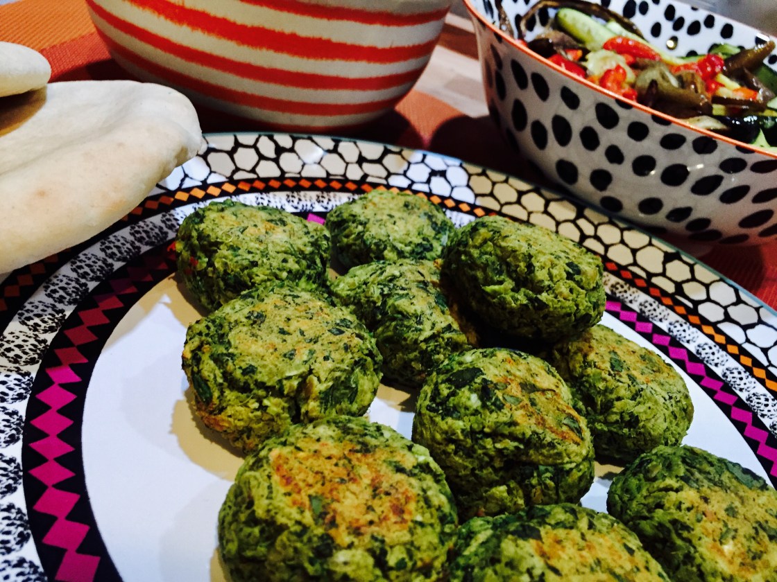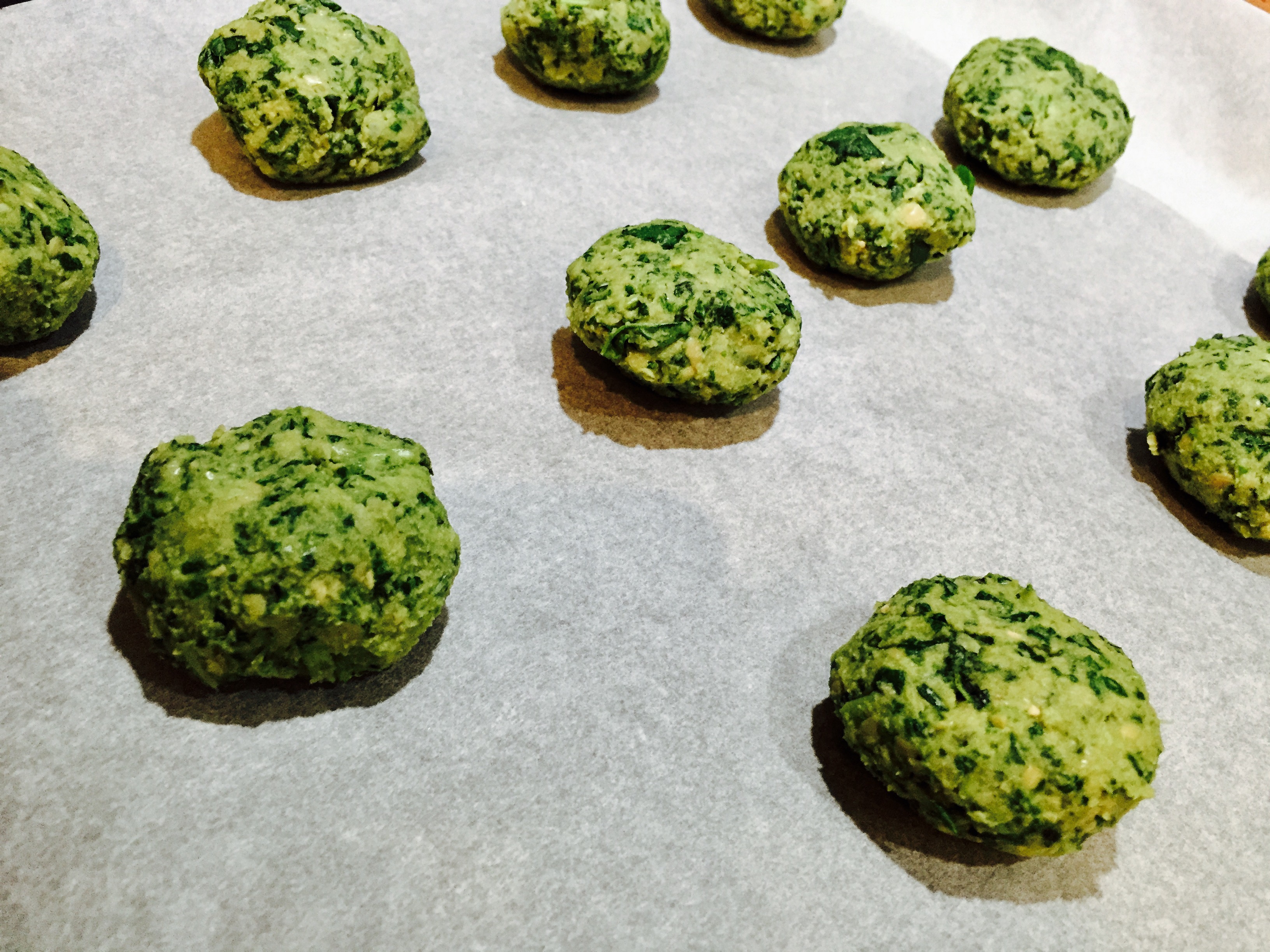 Es sollten sich ca. 9 Falafel formen lassen. Die Falafel auf ein mit Backpapier belegtem Blech im Ofen bei 180 Grad ca. 15-18 Minuten backen. Sie sollten aussen leicht braun sein und knusprig innen aber noch weich und saftig.