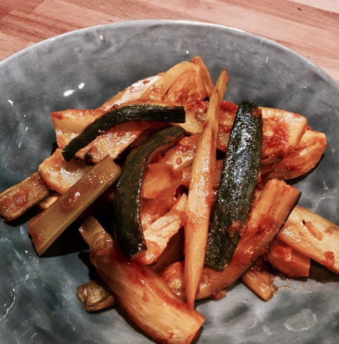 Anschliessend den Fenchel und die Zucchini dazugeben, salzen und von allen Seiten rösten. Sobald das Gemüse schön Farbe angenommen hat, sowohl das Tomatenmark dazugeben sowie den Sugo.