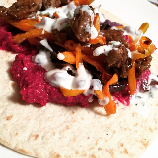 Tortillaswrap und eine Portion Rote Beete Hummus