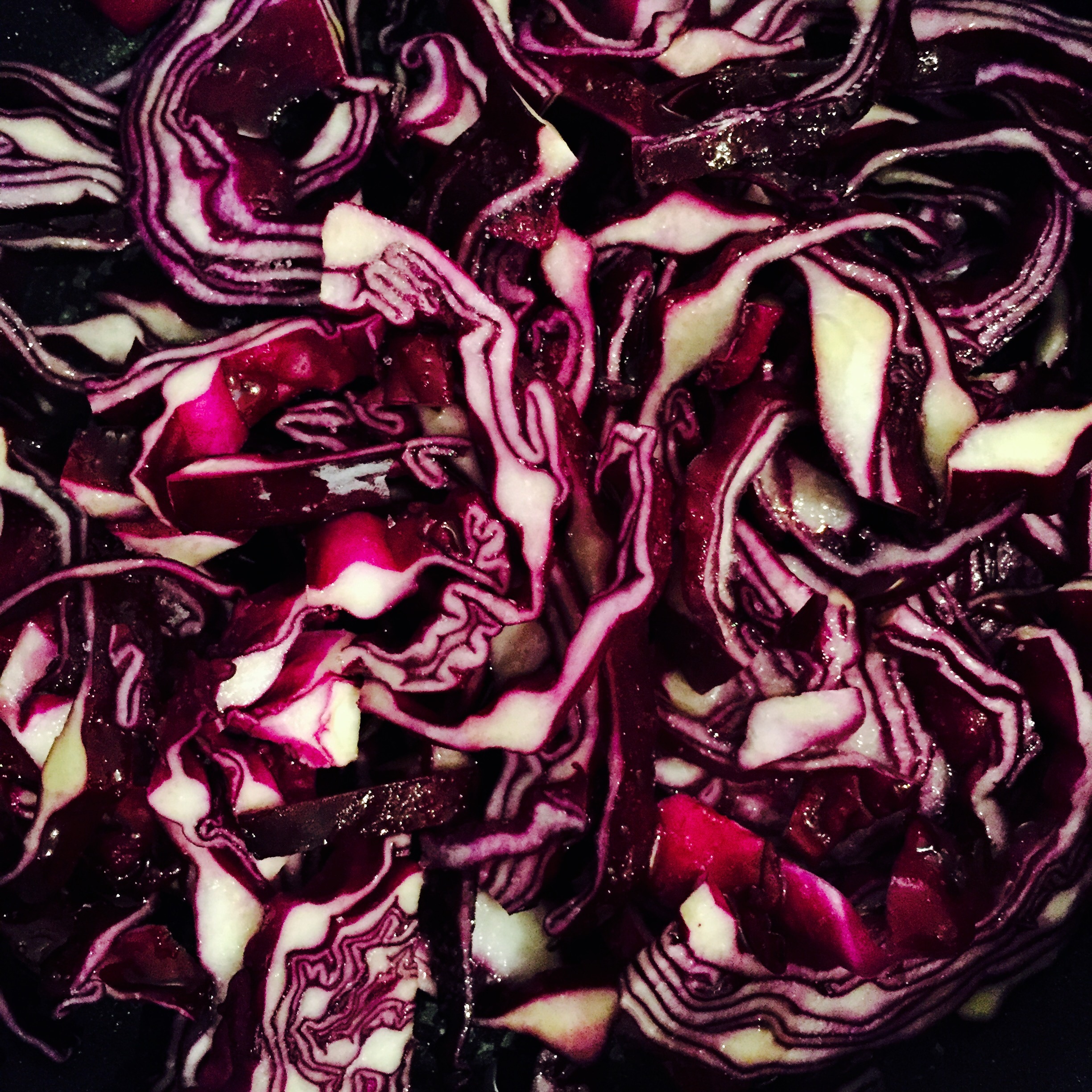Das Rotkraut ebenso in feine Streifen schneiden und in einer Pfanne mit Salz und Olivenöl dünsten. Sobald es weich ist aber dennoch etwas biss hat mit 1-2 Balsamicoessig löschen.