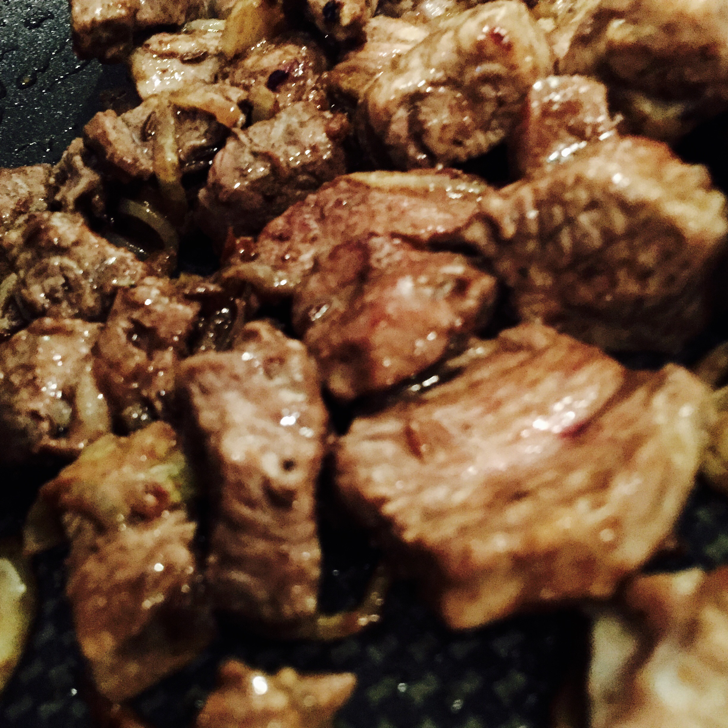 In der Zwischenzeit in einer grossen Pfanne die feingewürfelte Zwiebeln mit etwas Olivenöl dünsten. Anschliessend die Gewürze dazugeben und einige Minuten mitdünsten. Die gewürfelte Lammhuft dazugeben und bei mittlerer Hitze garen.