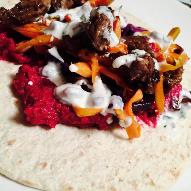 Tortillaswrap und eine Portion Rote Beete Hummus