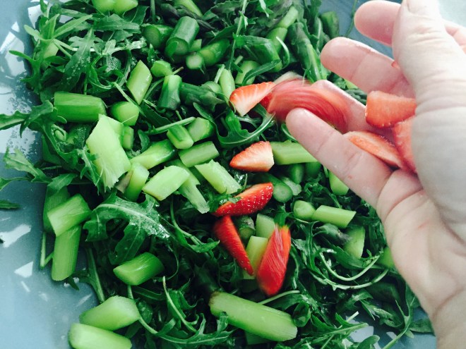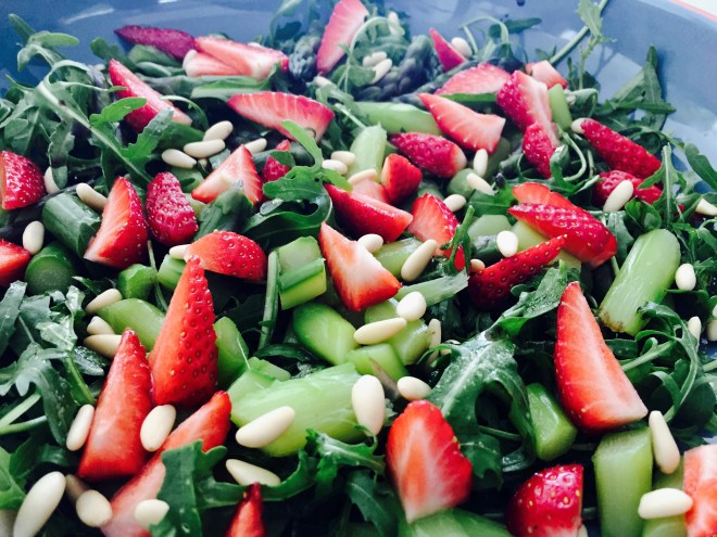 Den gegarten Spargeln in Stücke schneiden und mit den Erdbeeren, ebenso in Scheiben geschnitten, und den Pinienkerne auf dem Rucola verteilen.
