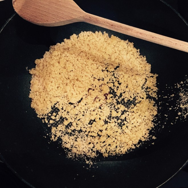 In einer weiteren Pfanne die Brotbrösel mit etwas Olivenöl goldbraun rösten.