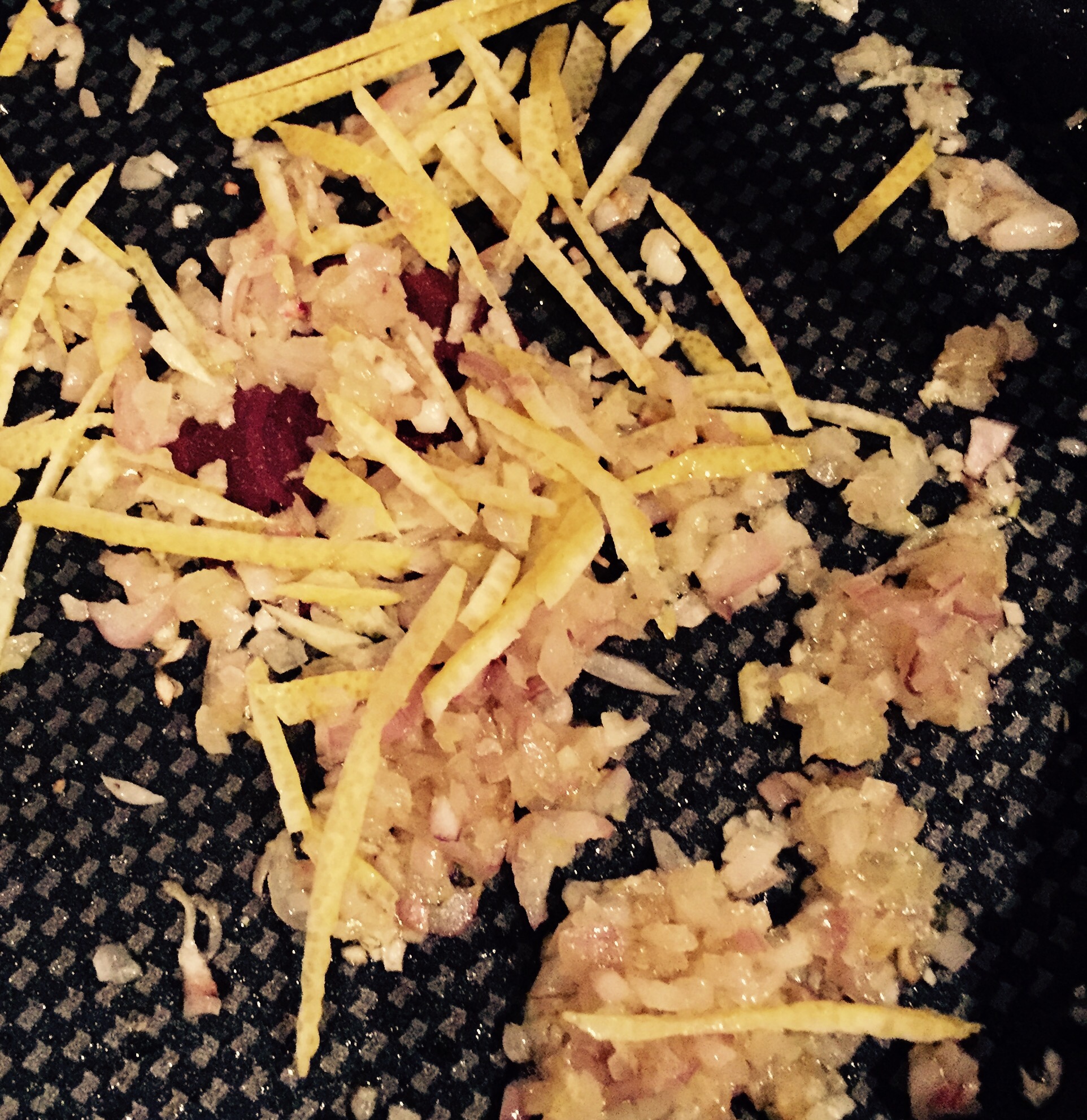 In der Zwischenzeit die Zitronenzeste in feine Streifen schneiden und anschliessend der weich gedünsteten Schalotte zusammen mit einer Keller heissem Wasser beifügen und einige Minuten mitdünsten.