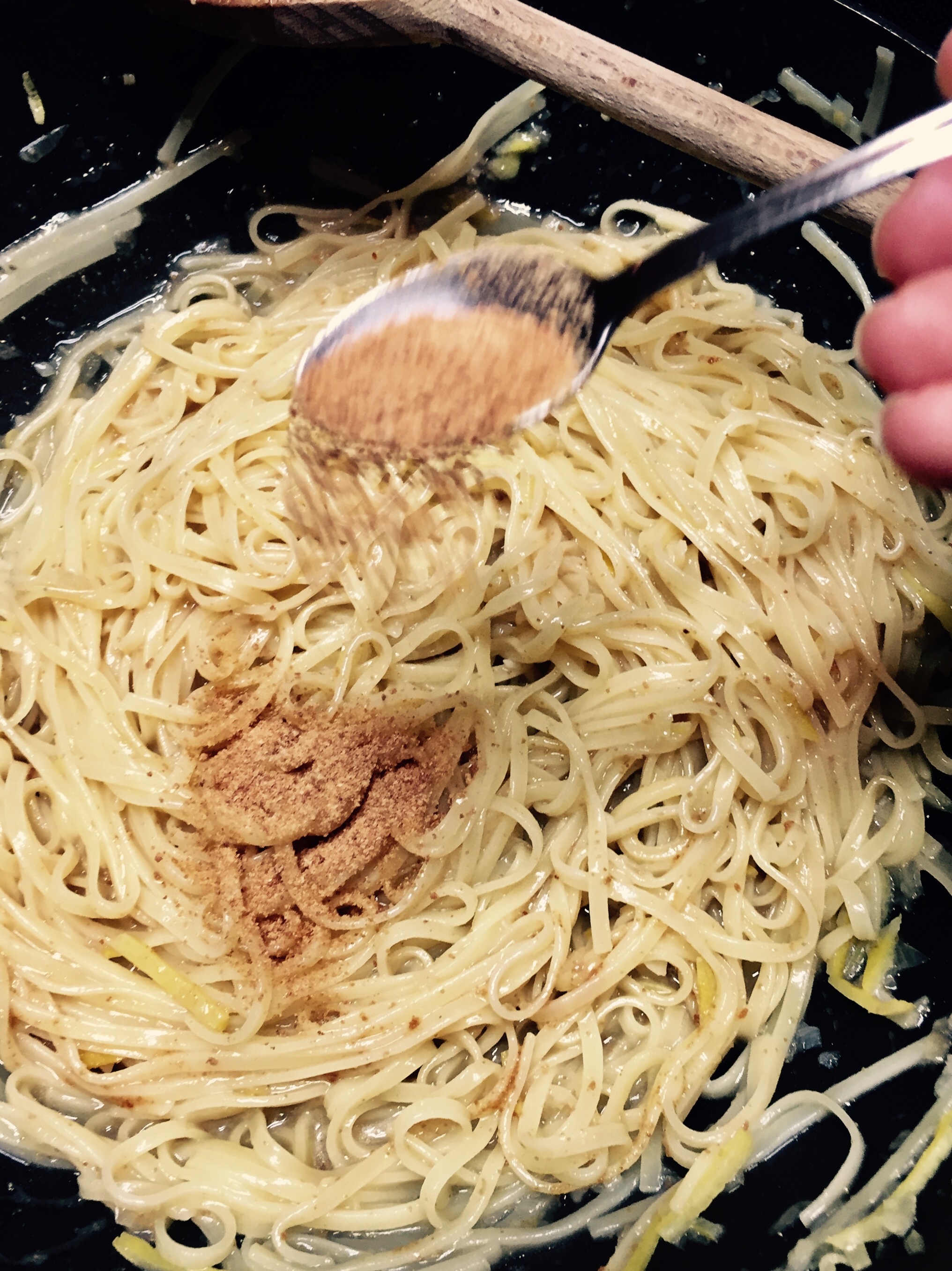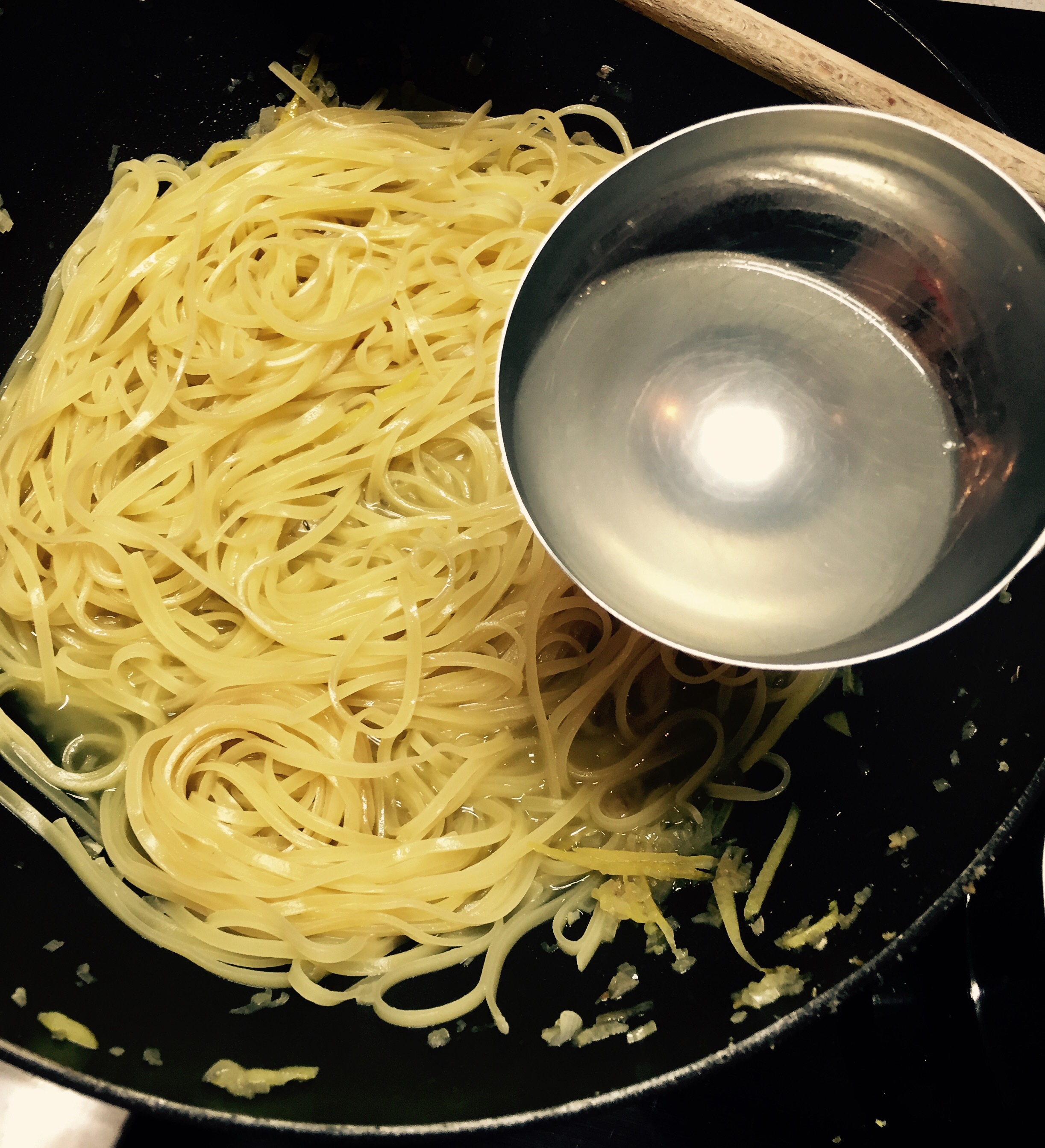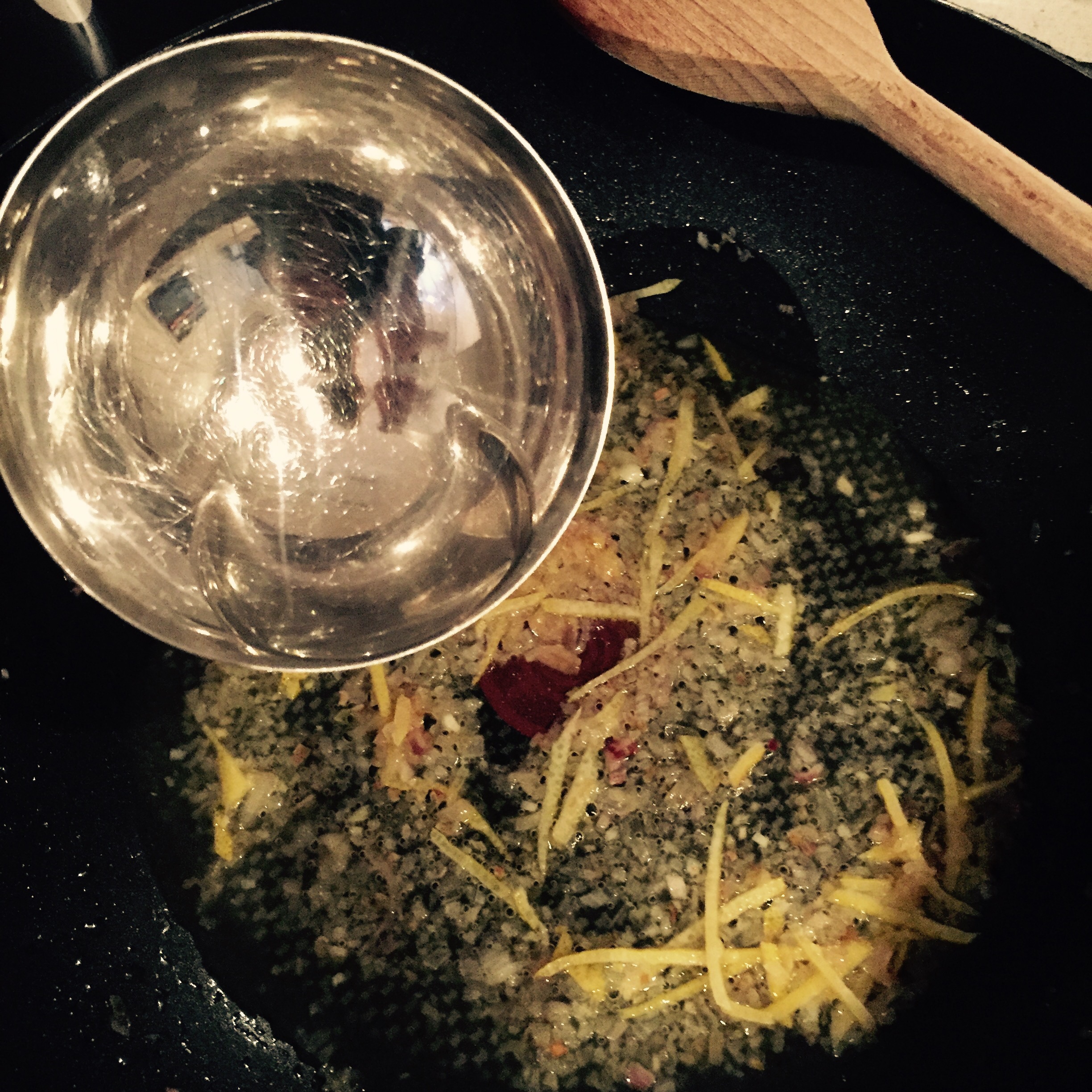 Die halbgaren Taglierini zu den Schalotten/Zitronenzeste geben und wie bei einem Risotto al dente fertig garen indem ihr immer wieder eine Kelle des aufgefangenen Kochwasser zufügt.