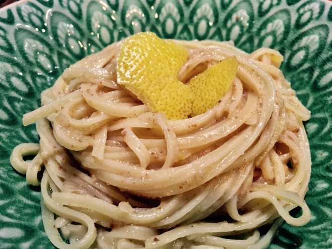 Sobald die Taglierini al dente gegart sind gebt ihr 2-3 Teelöffel geriebene Bottarga und die gerösteten Brotbrösel dazu und schwenkt die Pasta gut durch.