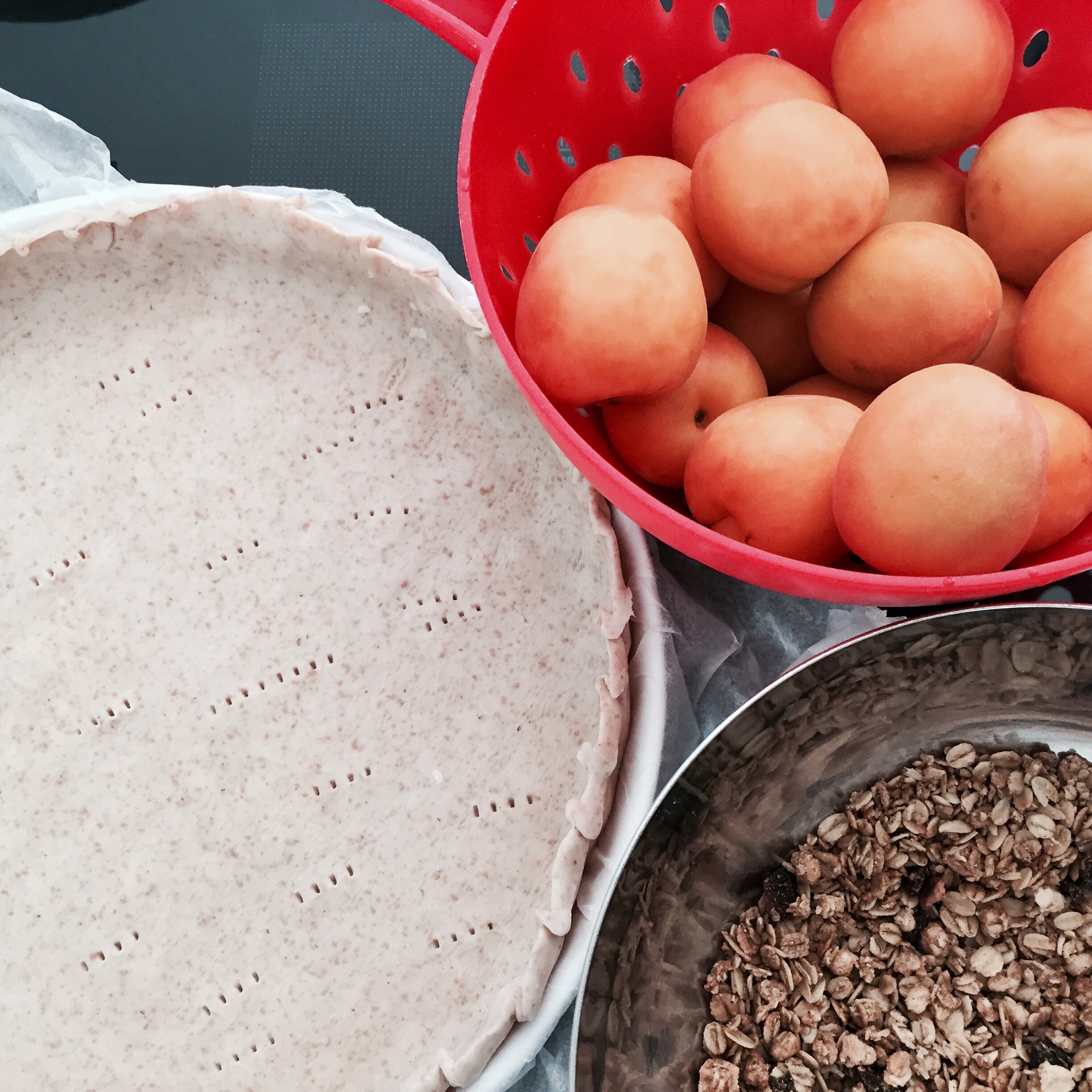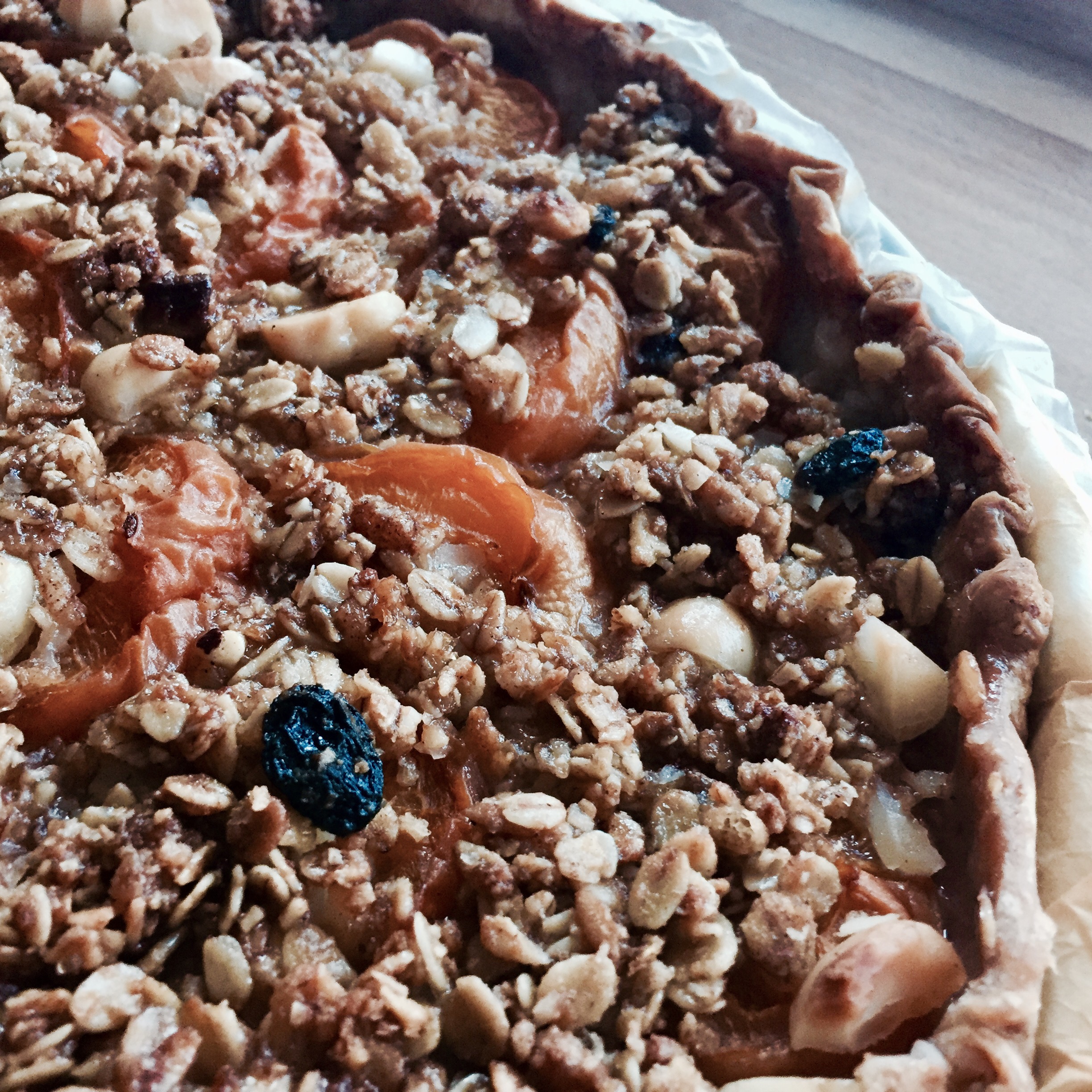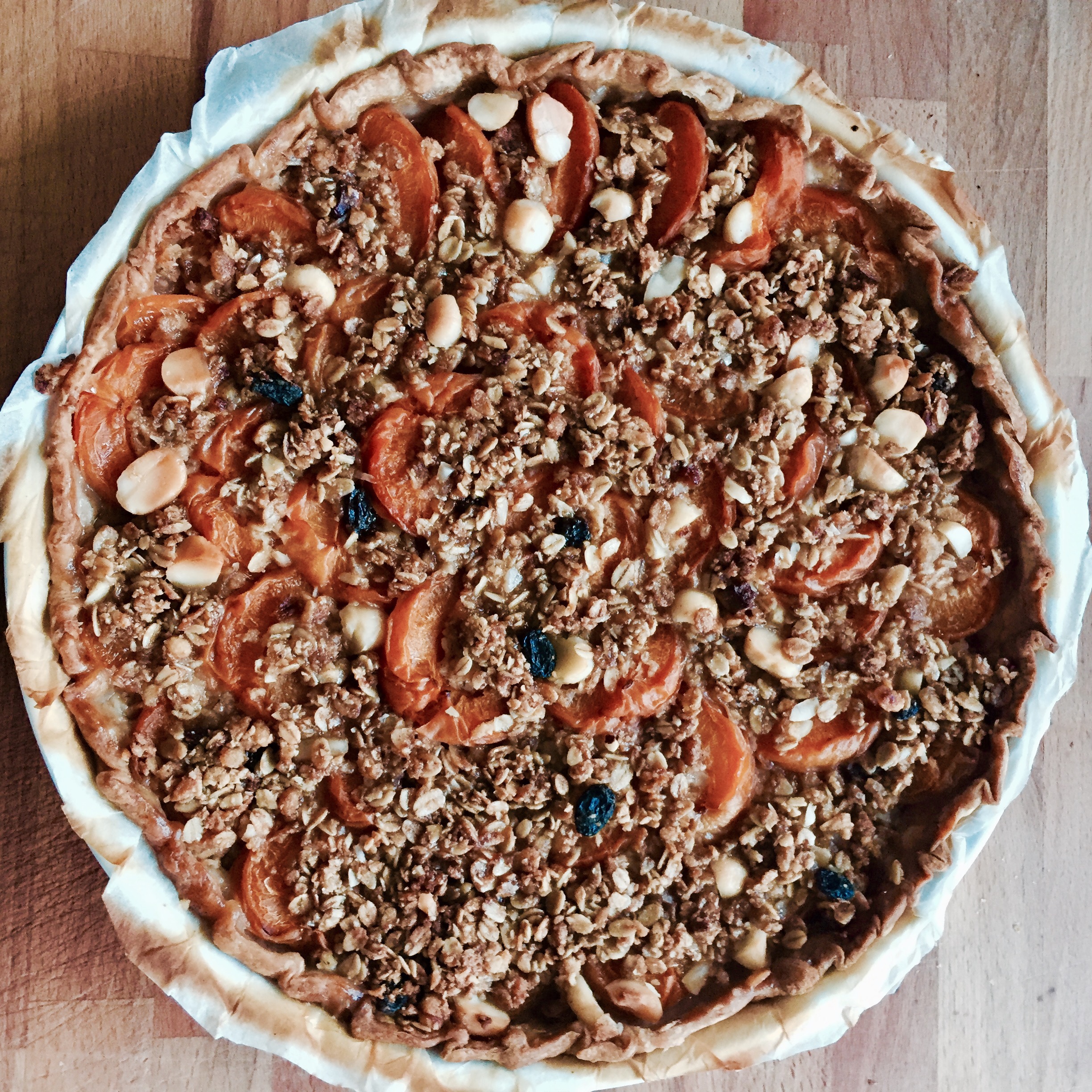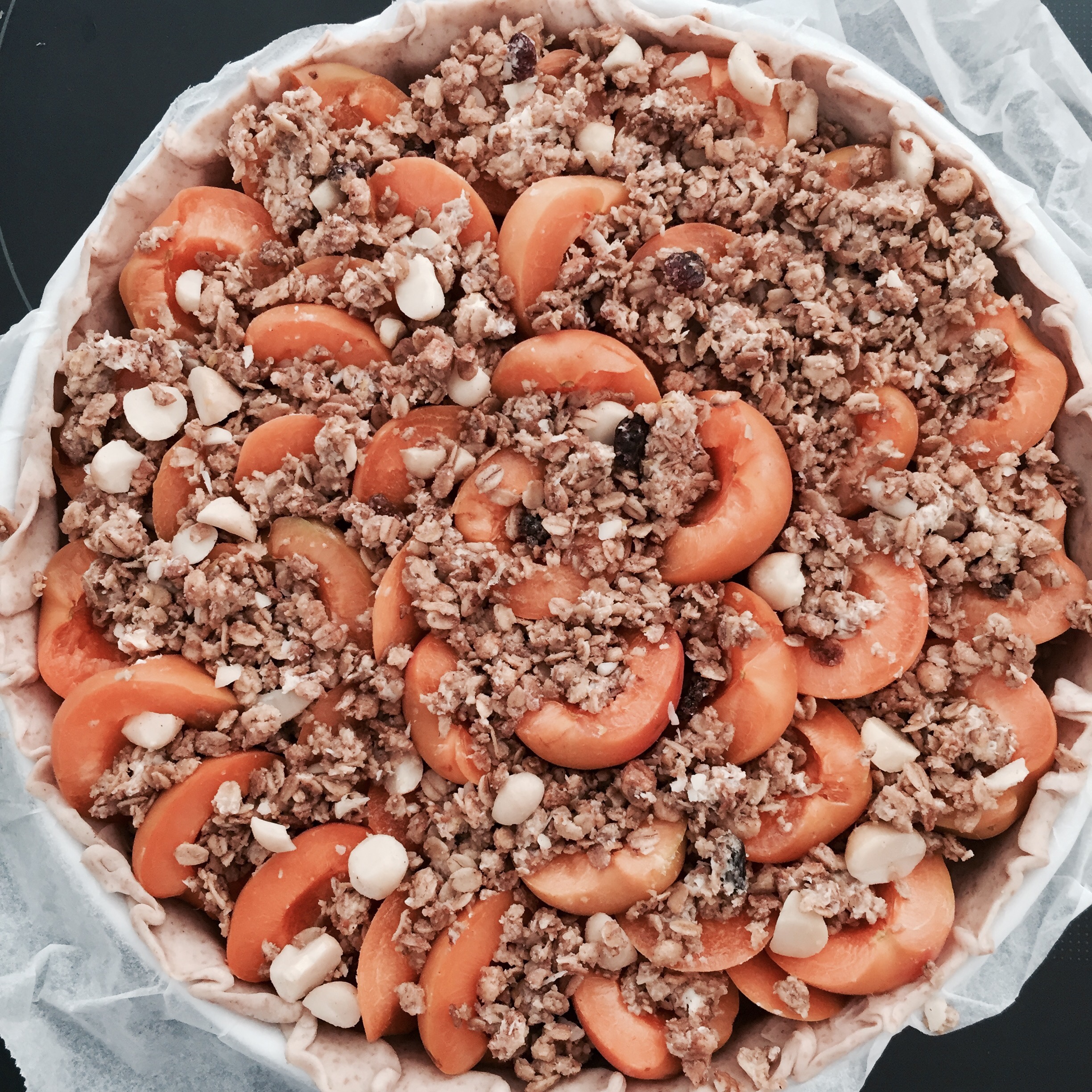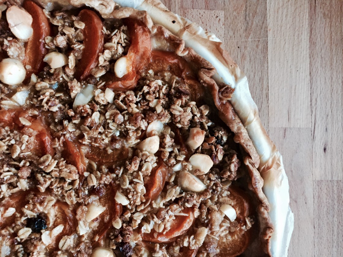 Die Tarte mit einem Blatt Butterpapier abdecken und solange im Ofen backen bis die Aprikosen am Rand etwas Saft gebildet haben und der Crumble schön knusprig ist.