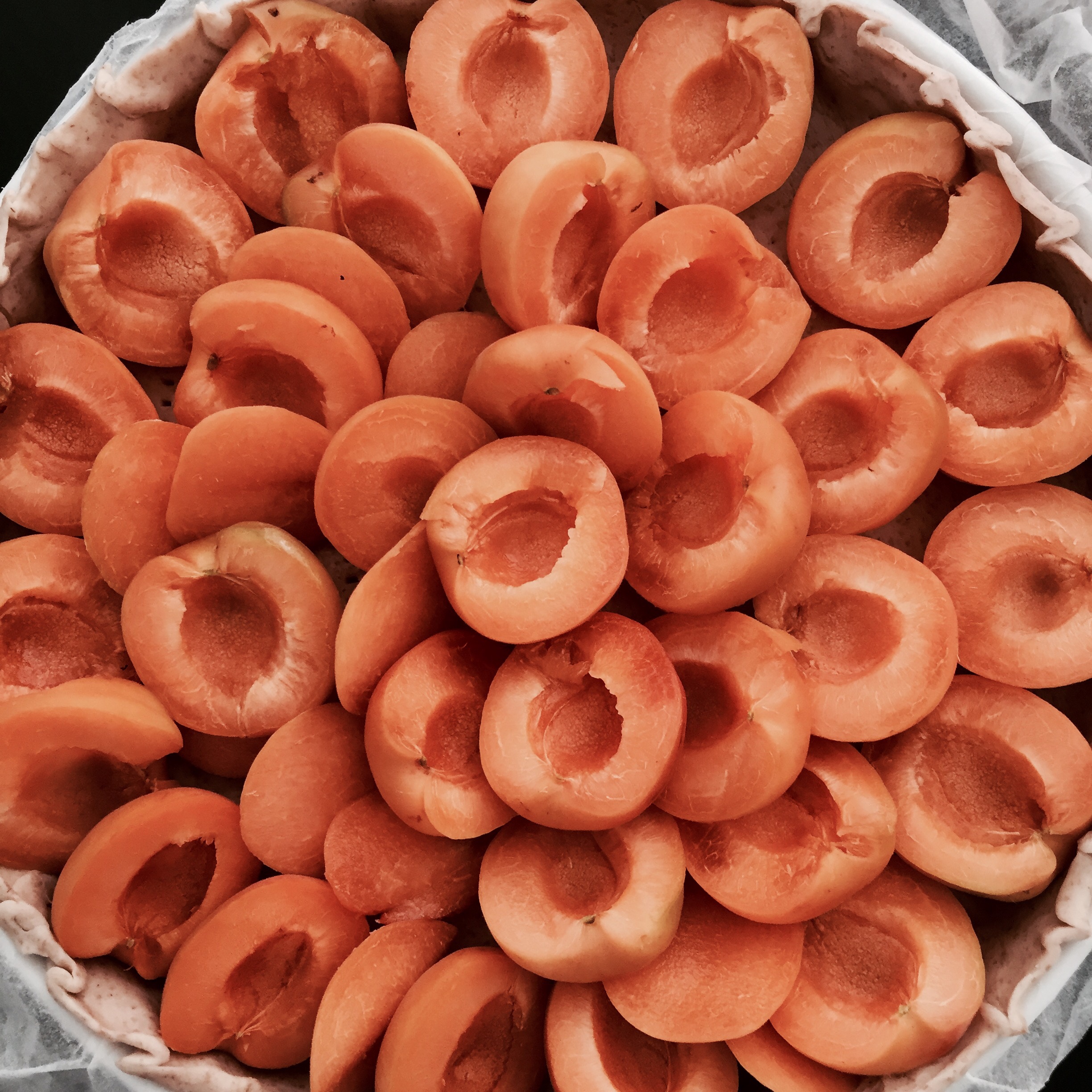 Den Mürbteig kreisförmig mit den Aprikosenhälften belegen. Die Aprikosen mit dem Zucker bestreuen.