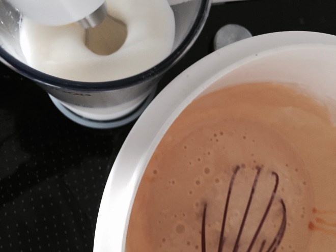 Eine hälfte des Eiweisses unterrühren, anschliessend die andere Hälfte vorsichtig von unten nach oben unterheben. Kurz im Kühlschrank ruhen lassen.