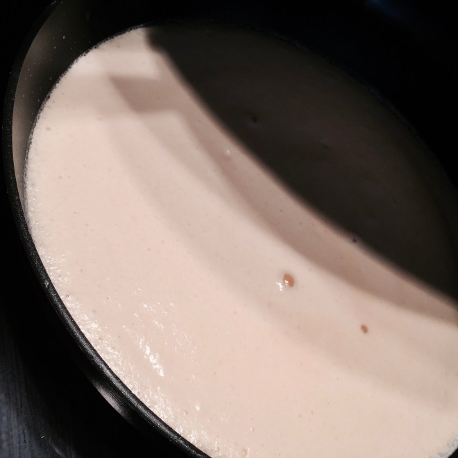 In einer grossen breiten Pfanne einen gestrichenen Esslöffel Butter schmelzen lassen und die hälfte des Teiges eingiessen und zudecken. Bei nicht zu grosser Hitze stocken lassen, der Teig sollte leicht aufgehen und Blasen werfen.