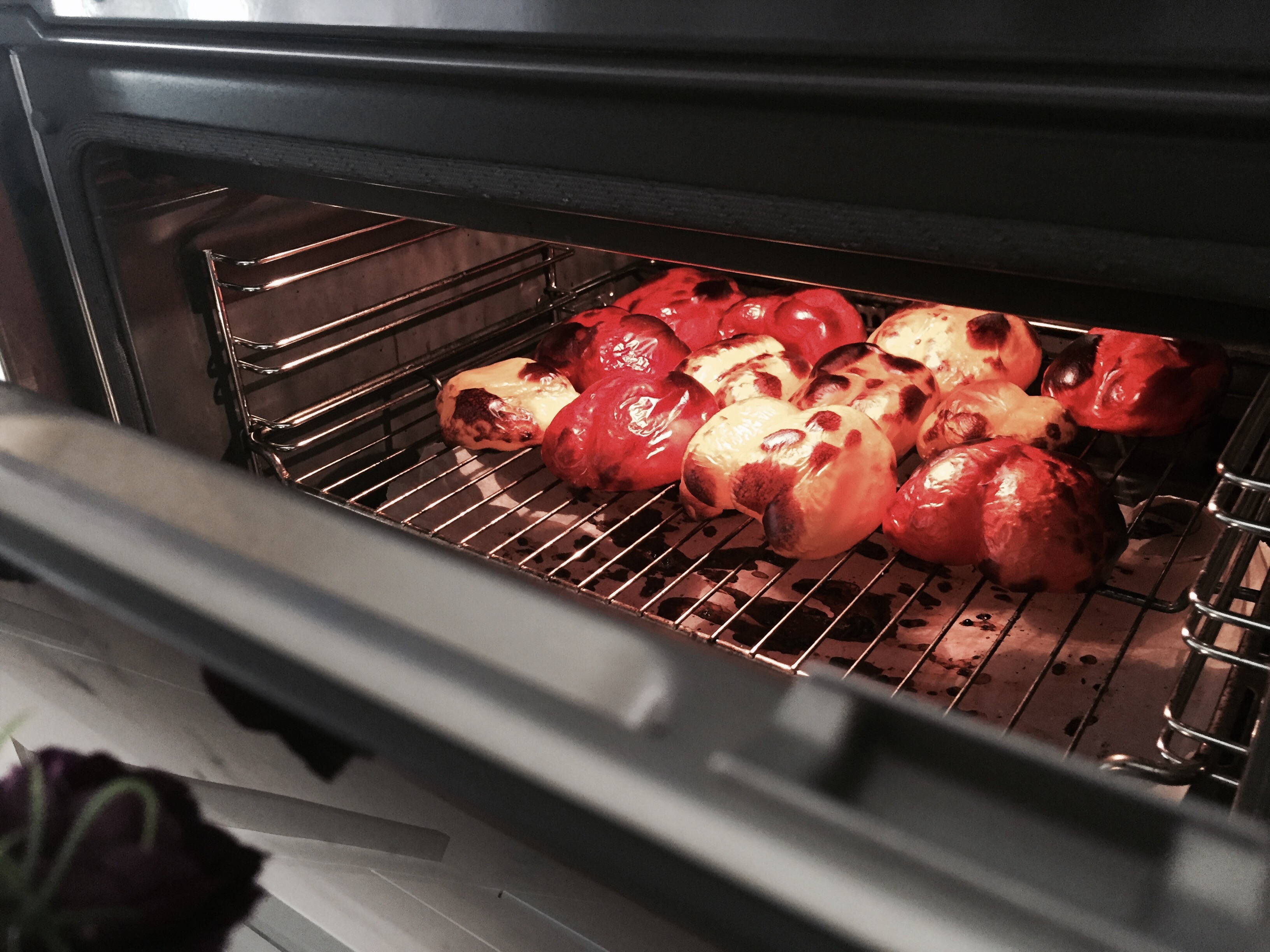 Die Paprika halbieren und das Kerngehäuse entfernen. Die Paprikahälften auf einen Grillrost im Ofen grillen bis die Haut schwarze Blasen wirft (dies kann man natürlich auch auf dem Grill machen).
