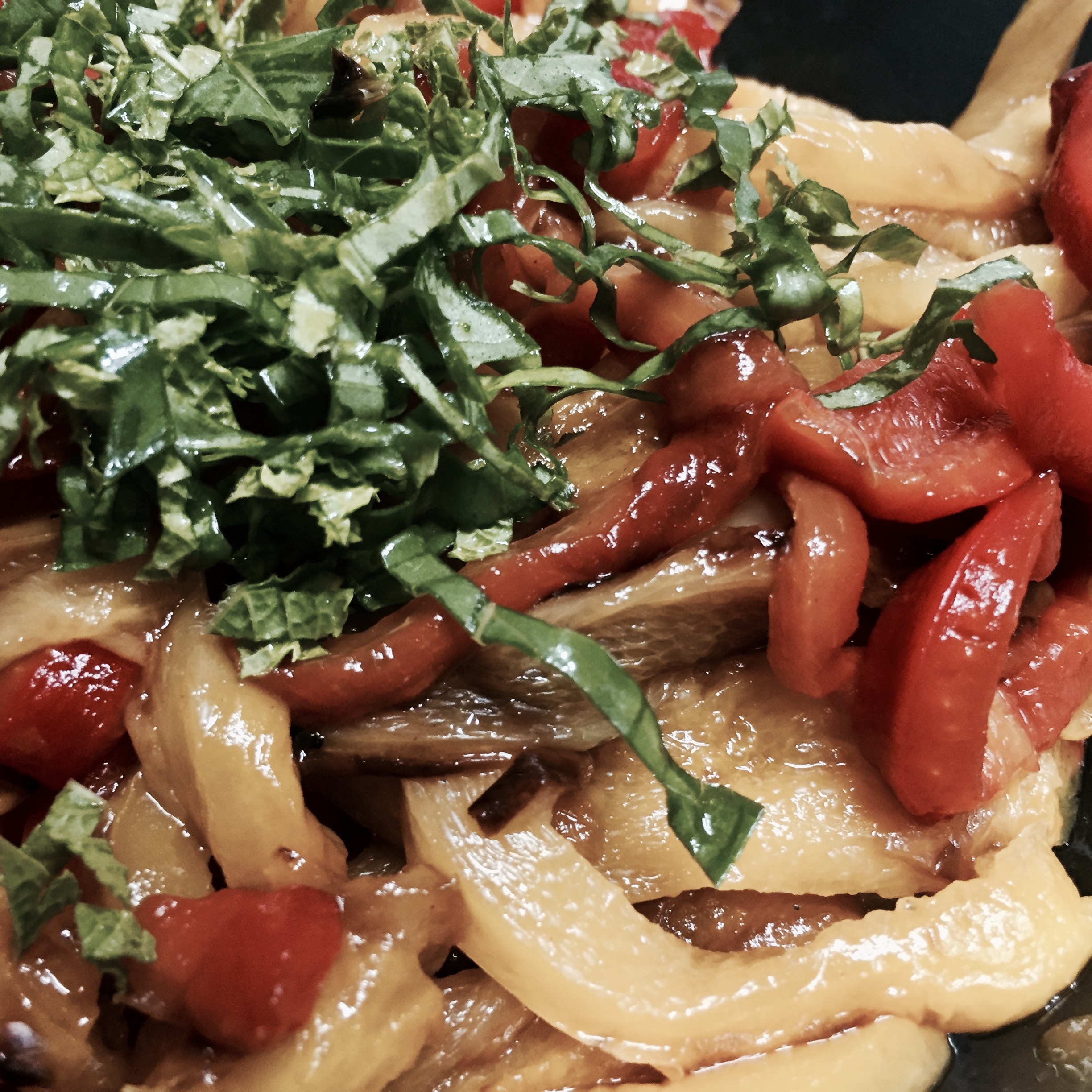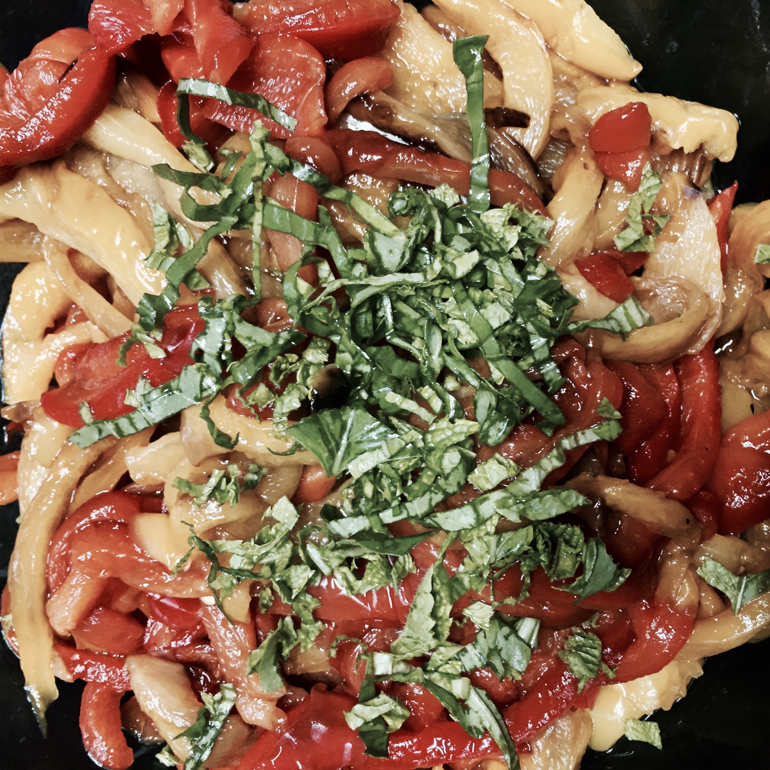Die Minzblätter (eine kleine Handvoll) und 2-3 Basilikumblätter sehr fein hacken und ebnso zu den Paprikas geben.