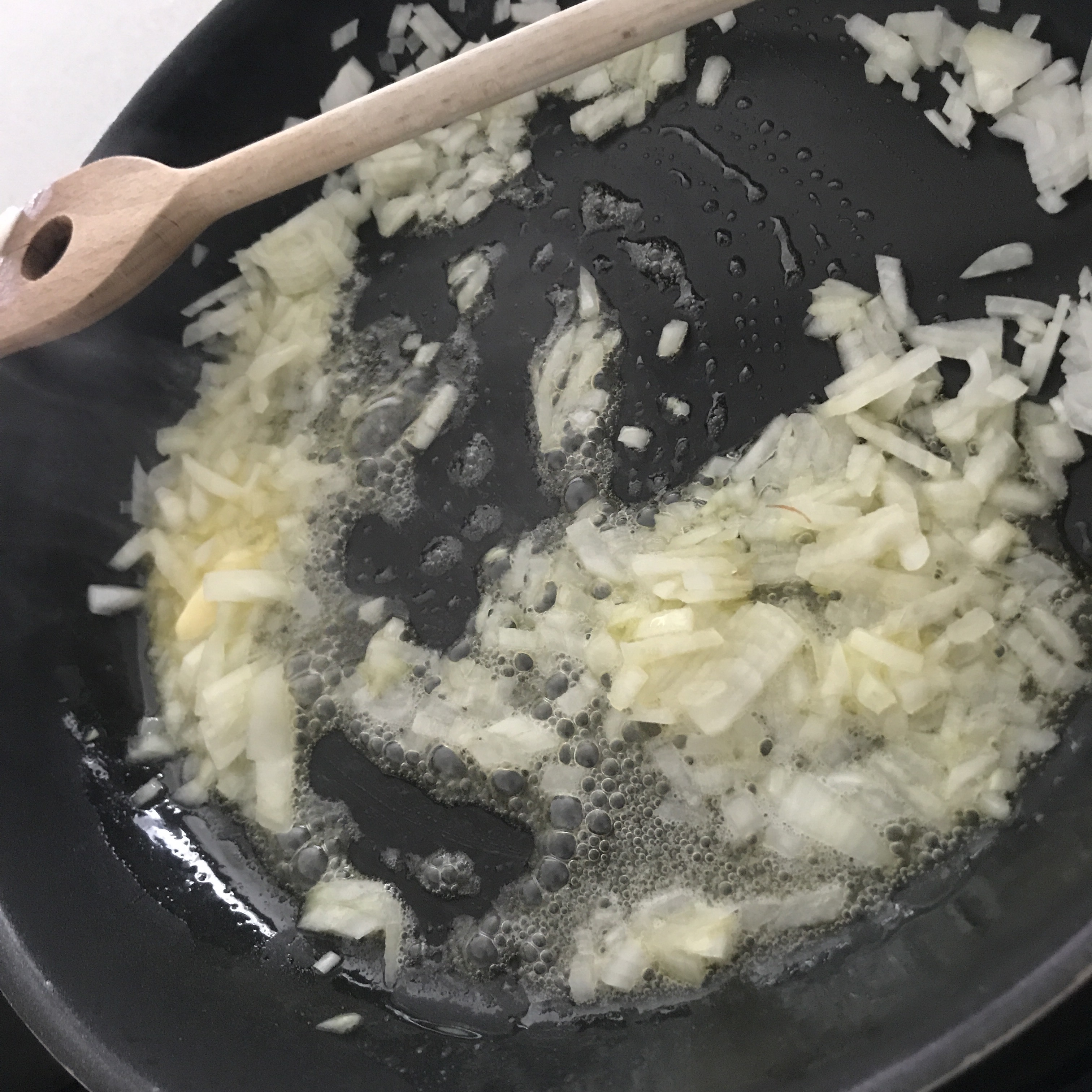 Die Zwiebel fein würfeln und einer grossen Pfanne mit einem Esslöffel Butter und etwas Olivenöl glasig dünsten.