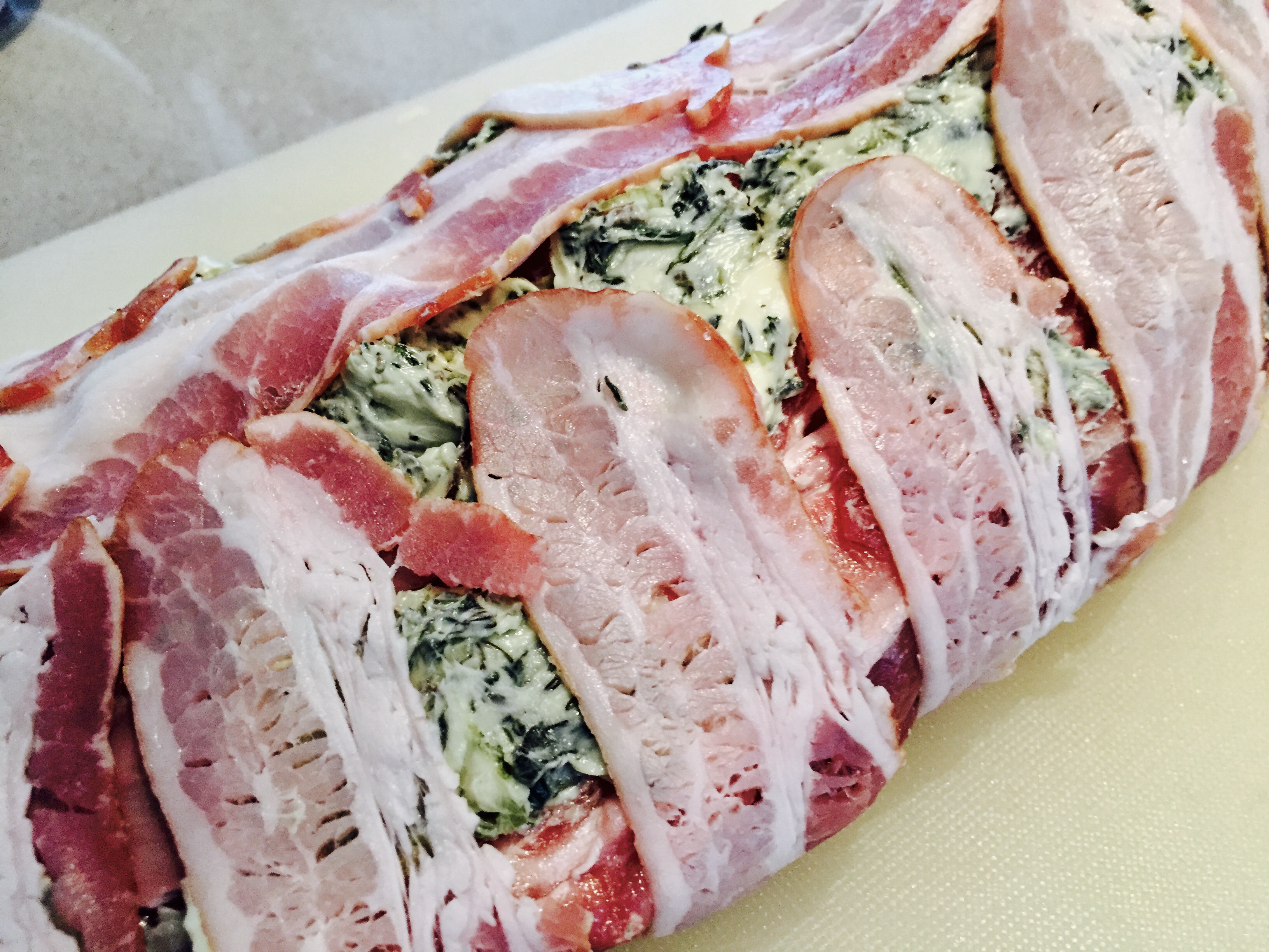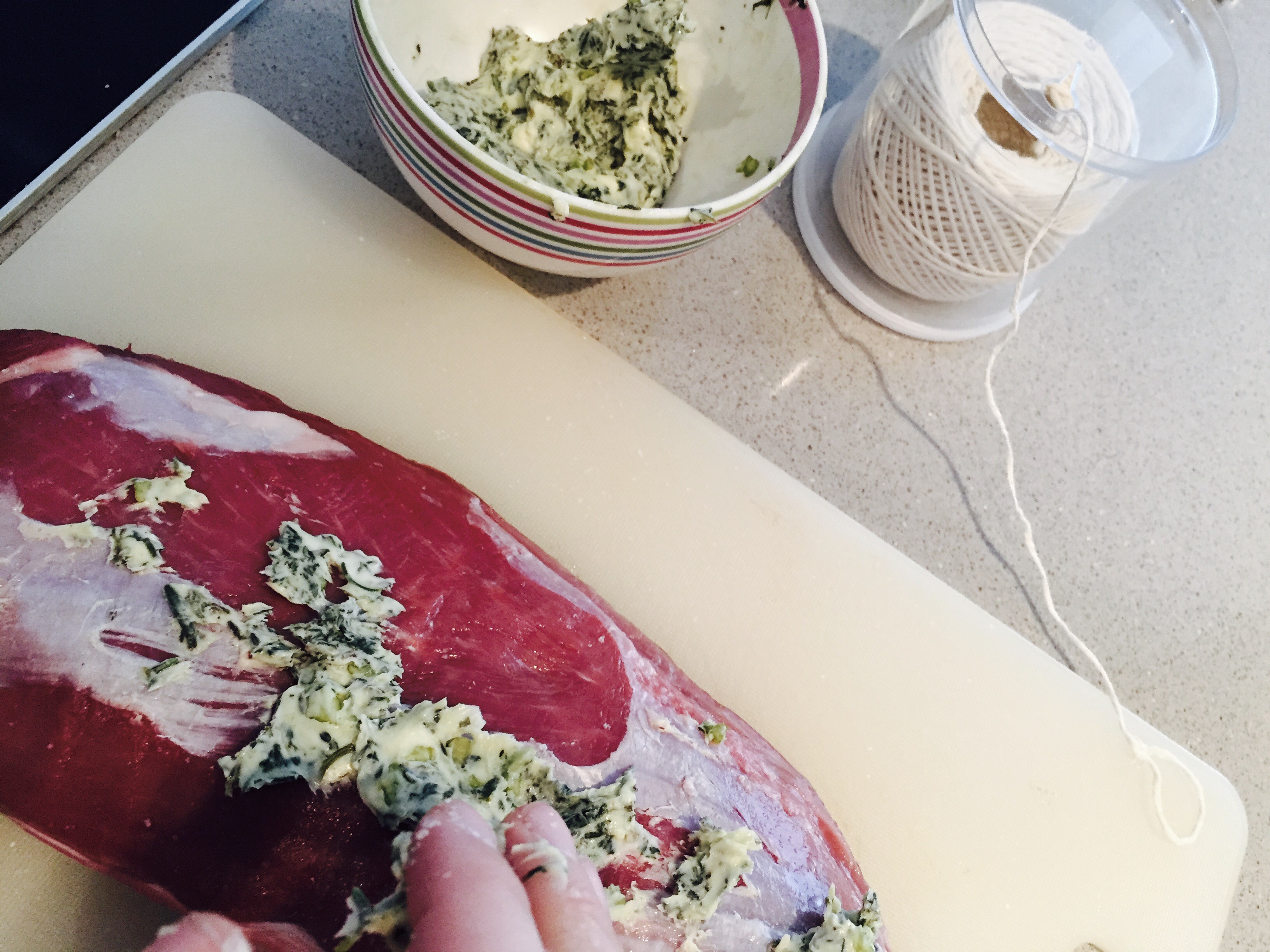 Den Kalbsbraten damit bestreichen und mit dem Frühstücksspeck einschlagen. Den Braten mit Kochgarn binden.